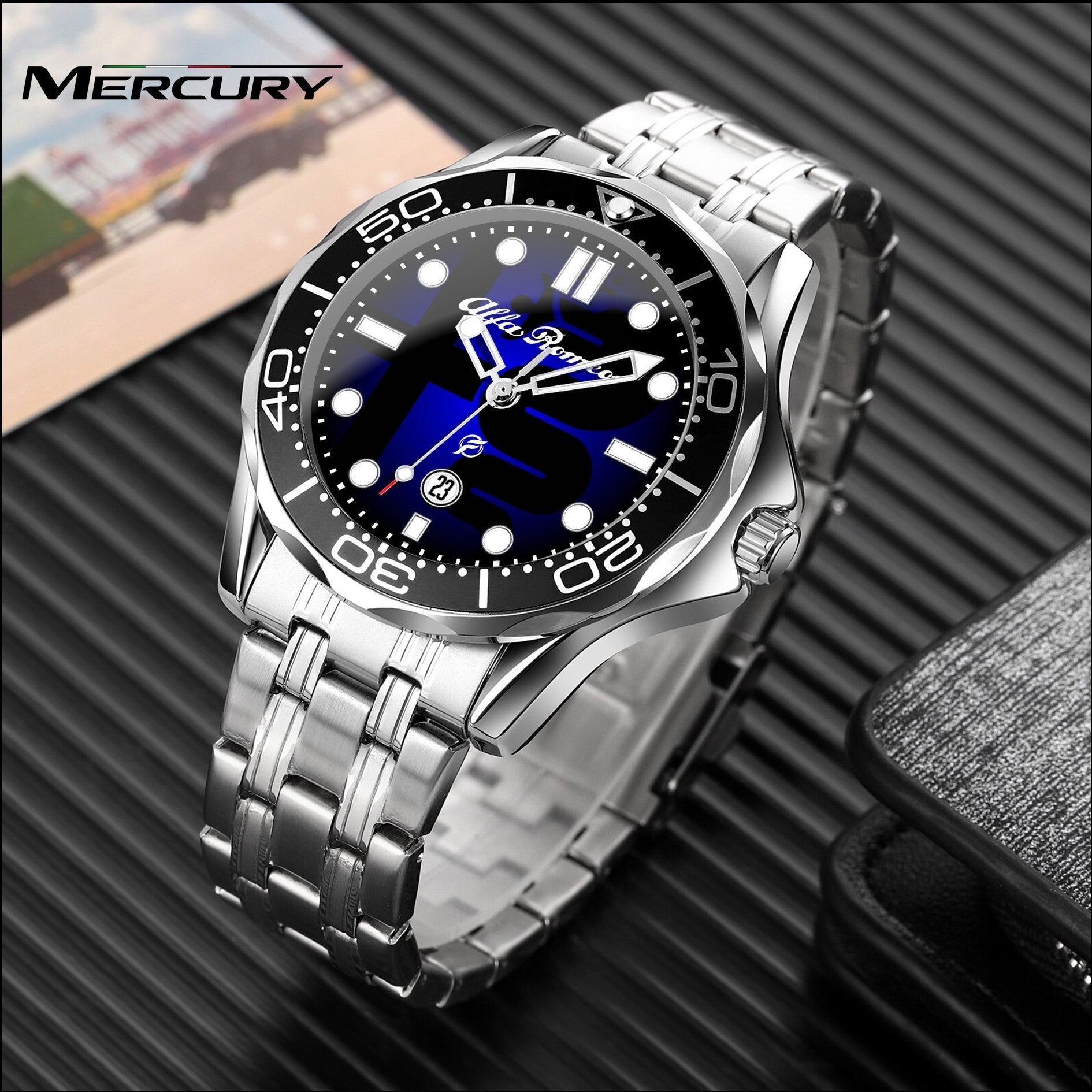 Caratteristiche tecniche dell'orologio Mercury: confezione in cartone rivestito inciso a laser. Il quadrante presenta una superficie stampata con indici sovraesposti. Design unisex. La cassa ha un diametro di 43 mm ed è realizzata in acciaio inossidabile. Il cinturino, anch'esso in acciaio inossidabile, ha una larghezza di 20 mm e utilizza un sistema di chiusura con gancio rapido. L'orologio è alimentato da un movimento al quarzo Epson a batteria. Il peso totale è di 136 grammi e offre una resistenza all'acqua fino a 3 ATM.
