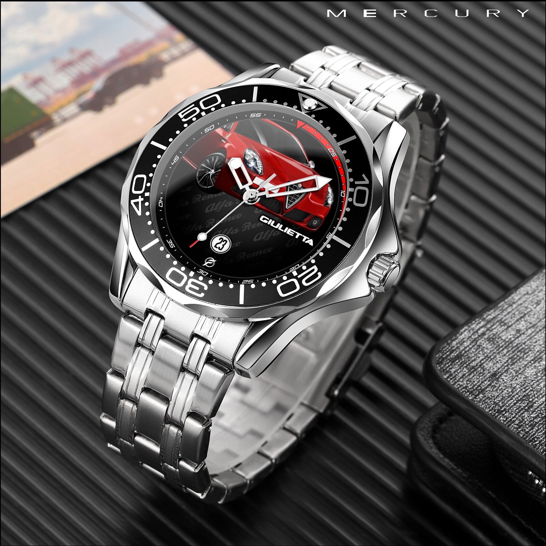 Caratteristiche tecniche dell'orologio Mercury: confezione in cartone rivestito inciso a laser. Il quadrante presenta una superficie stampata con indici sovraesposti. Design unisex. La cassa ha un diametro di 43 mm ed è realizzata in acciaio inossidabile. Il cinturino, anch'esso in acciaio inossidabile, ha una larghezza di 20 mm e utilizza un sistema di chiusura con gancio rapido. L'orologio è alimentato da un movimento al quarzo Epson a batteria. Il peso totale è di 136 grammi e offre una resistenza all'acqua fino a 3 ATM.