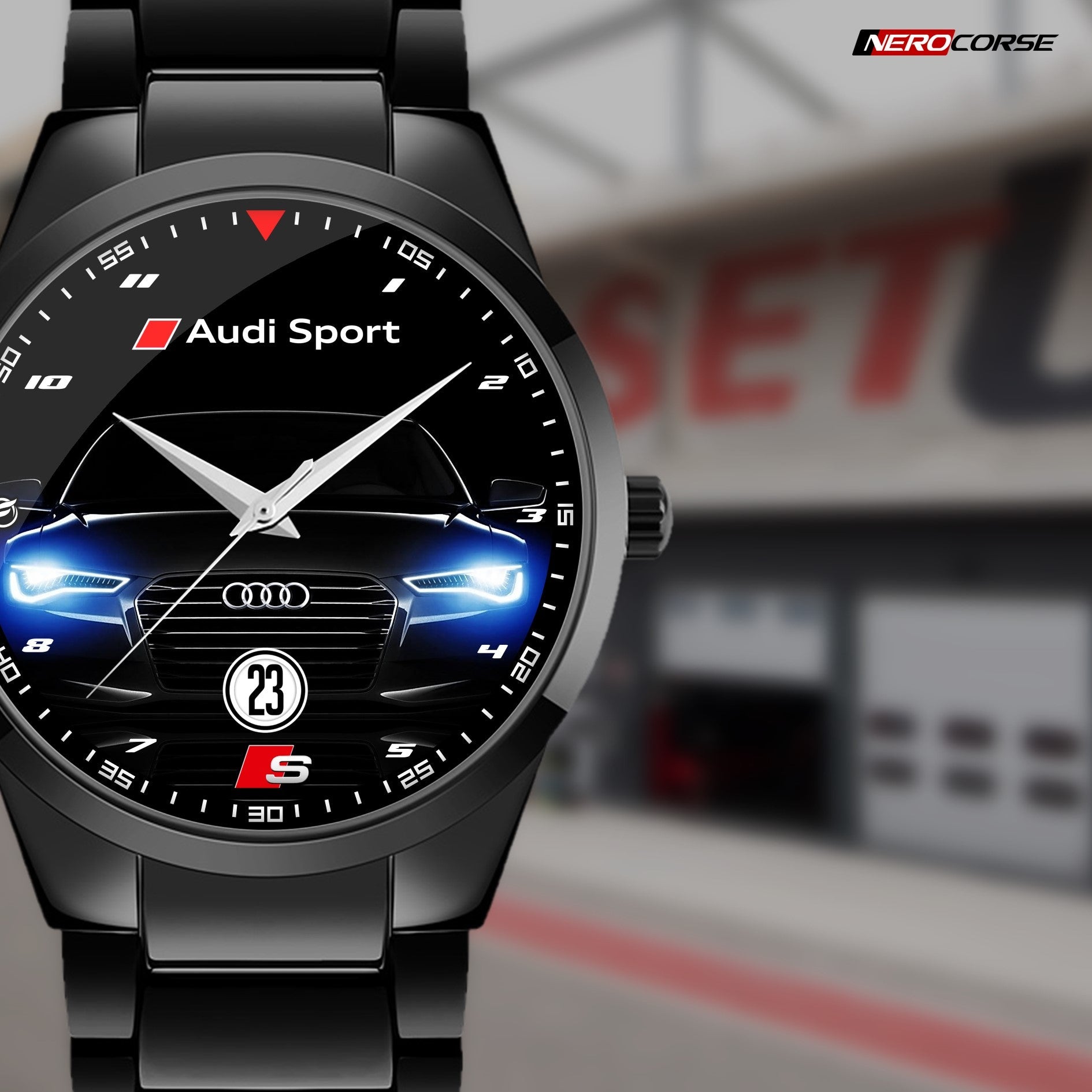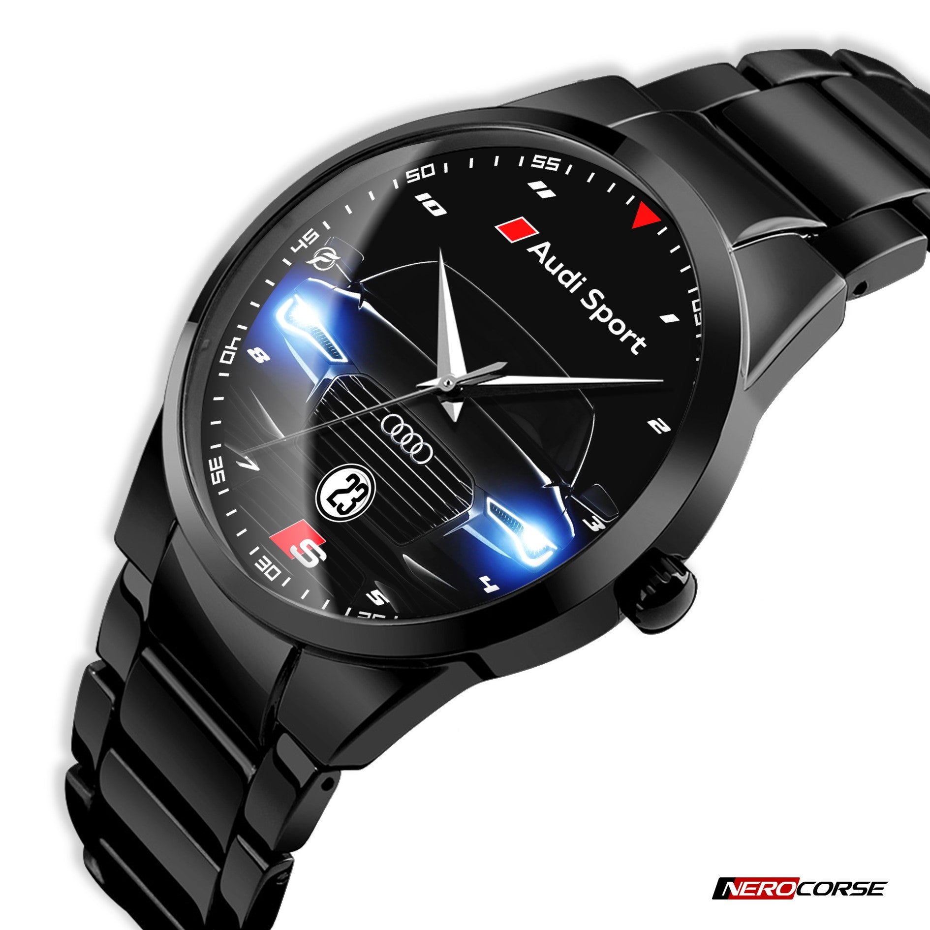 Caratteristiche tecniche dell'orologio modello Nerocorse: confezione in cartone rivestito inciso a laser. Il quadrante è realizzato con una superficie stampata ad alta definizione. Design unisex. La cassa ha un diametro di 40 mm ed è realizzata in acciaio inossidabile con finitura nera lucida. Il cinturino, anch'esso in acciaio inossidabile nero lucido, ha una larghezza di 20 mm e utilizza un sistema di chiusura con gancio rapido. L'orologio è dotato di un movimento al quarzo Epson alimentato a batteria. Il peso complessivo è di 114 grammi e offre una resistenza all'acqua fino a 3 ATM.