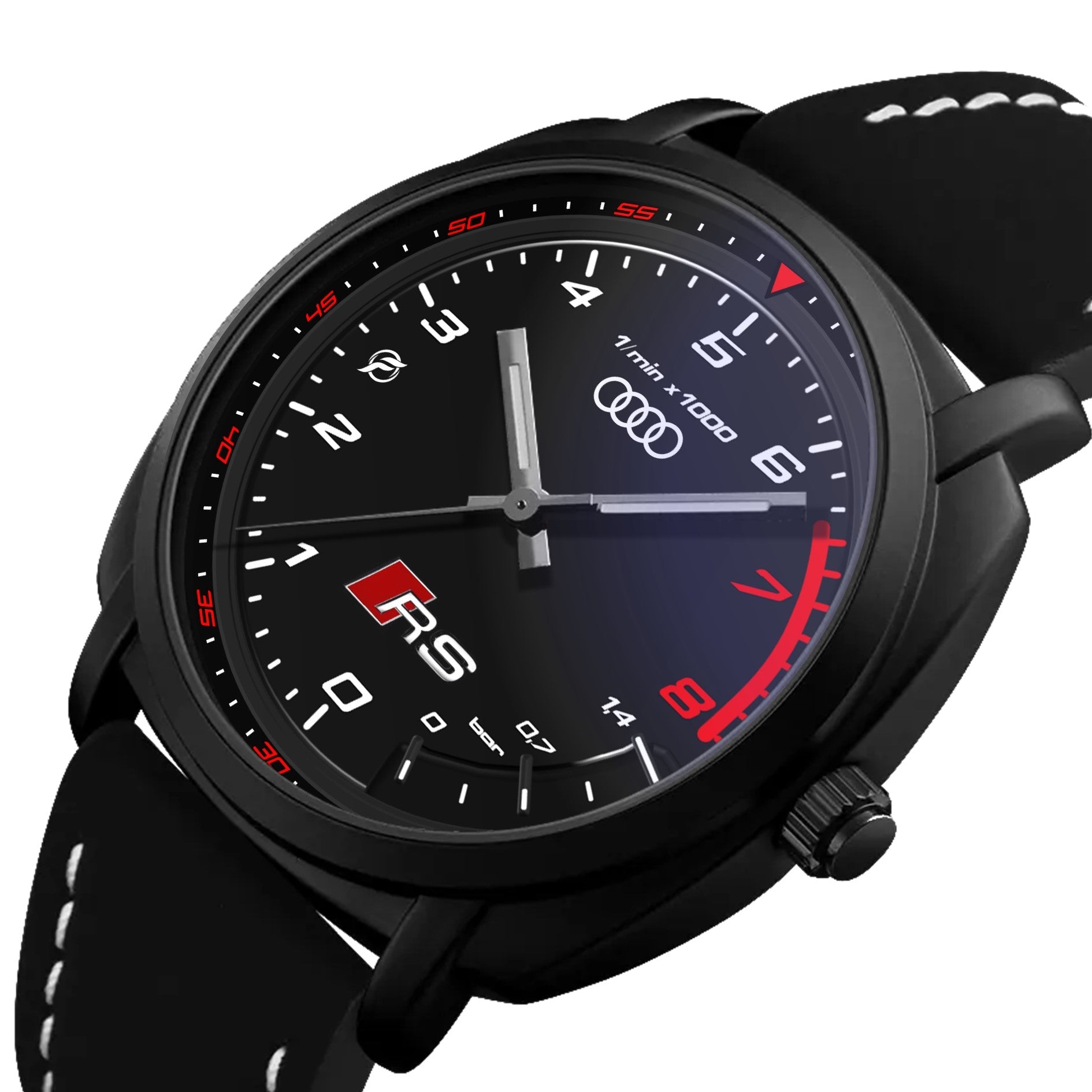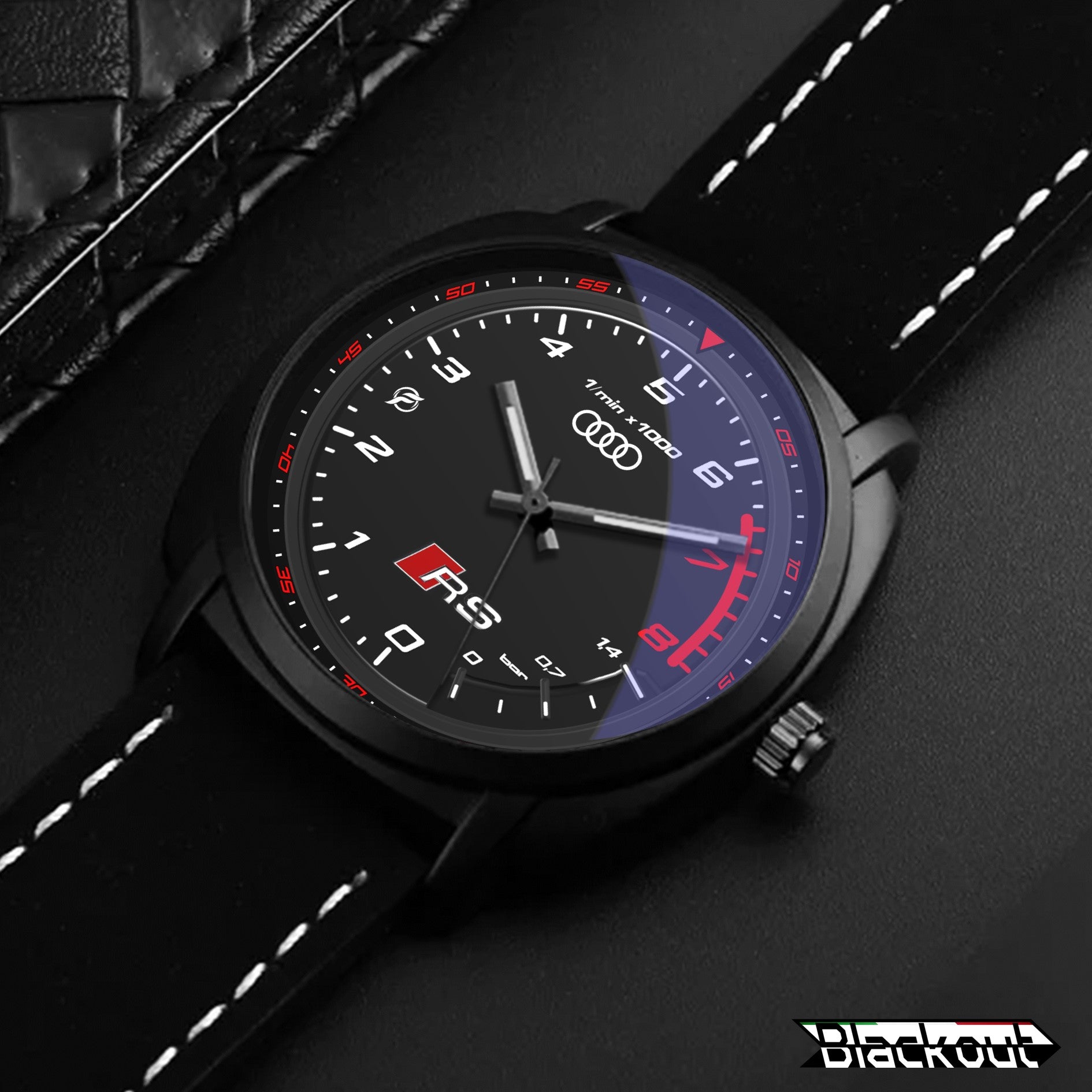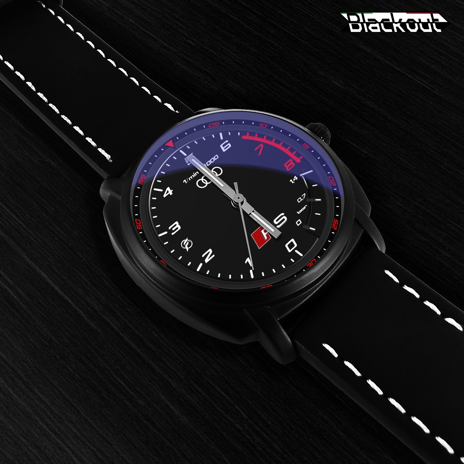 Caratteristiche tecniche dell'orologio Blackout: confezione in cartone rivestito inciso a laser, quadrante con superficie stampata da Canon, design unisex. La cassa ha un diametro di 42 mm ed è realizzata in acciaio inossidabile con finitura nera opaca. Il cinturino ha una larghezza di 22 mm ed è in eco-pelle con cuciture bianche. L'orologio è dotato di una fibbia come tipo di fermaglio e utilizza un movimento al quarzo Epson, alimentato a batteria. Il peso complessivo è di 56 grammi e la resistenza all'acqua è garantita fino a 3 ATM.