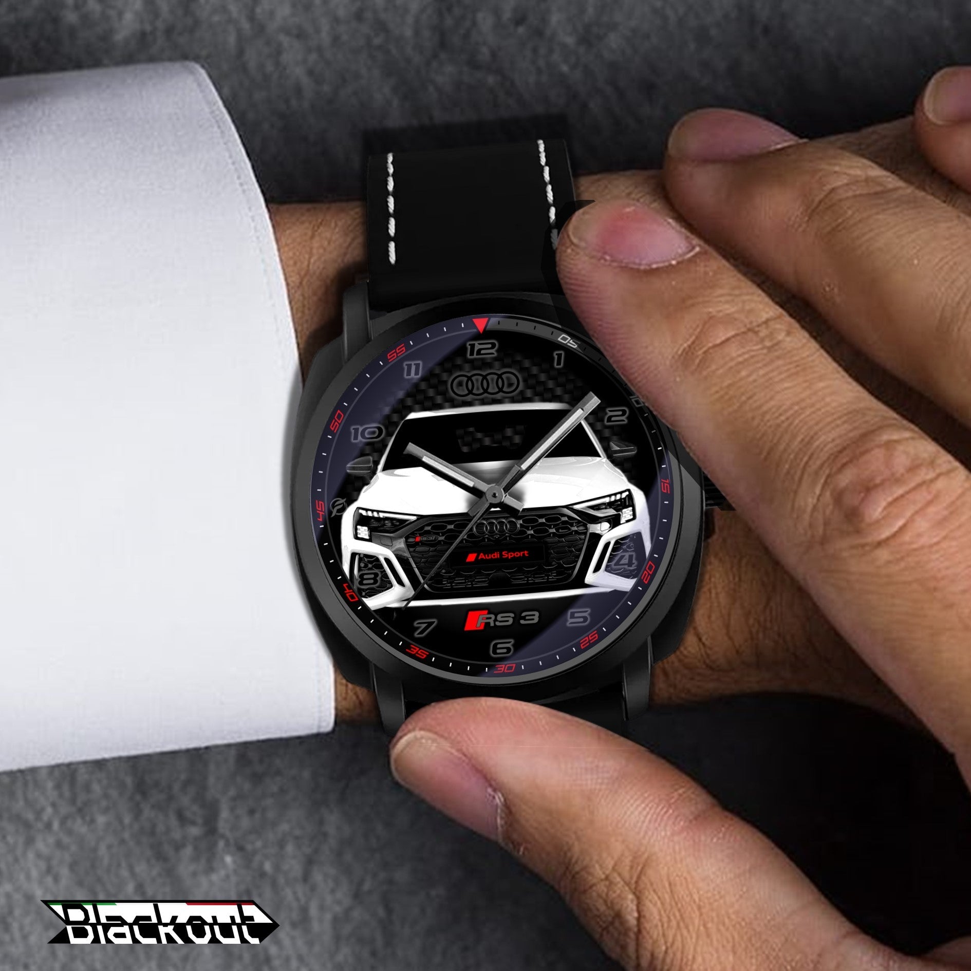 Caratteristiche tecniche dell'orologio Blackout: confezione in cartone rivestito inciso a laser, quadrante con superficie stampata da Canon, design unisex. La cassa ha un diametro di 42 mm ed è realizzata in acciaio inossidabile con finitura nera opaca. Il cinturino ha una larghezza di 22 mm ed è in eco-pelle con cuciture bianche. L'orologio è dotato di una fibbia come tipo di fermaglio e utilizza un movimento al quarzo Epson, alimentato a batteria. Il peso complessivo è di 56 grammi e la resistenza all'acqua è garantita fino a 3 ATM.