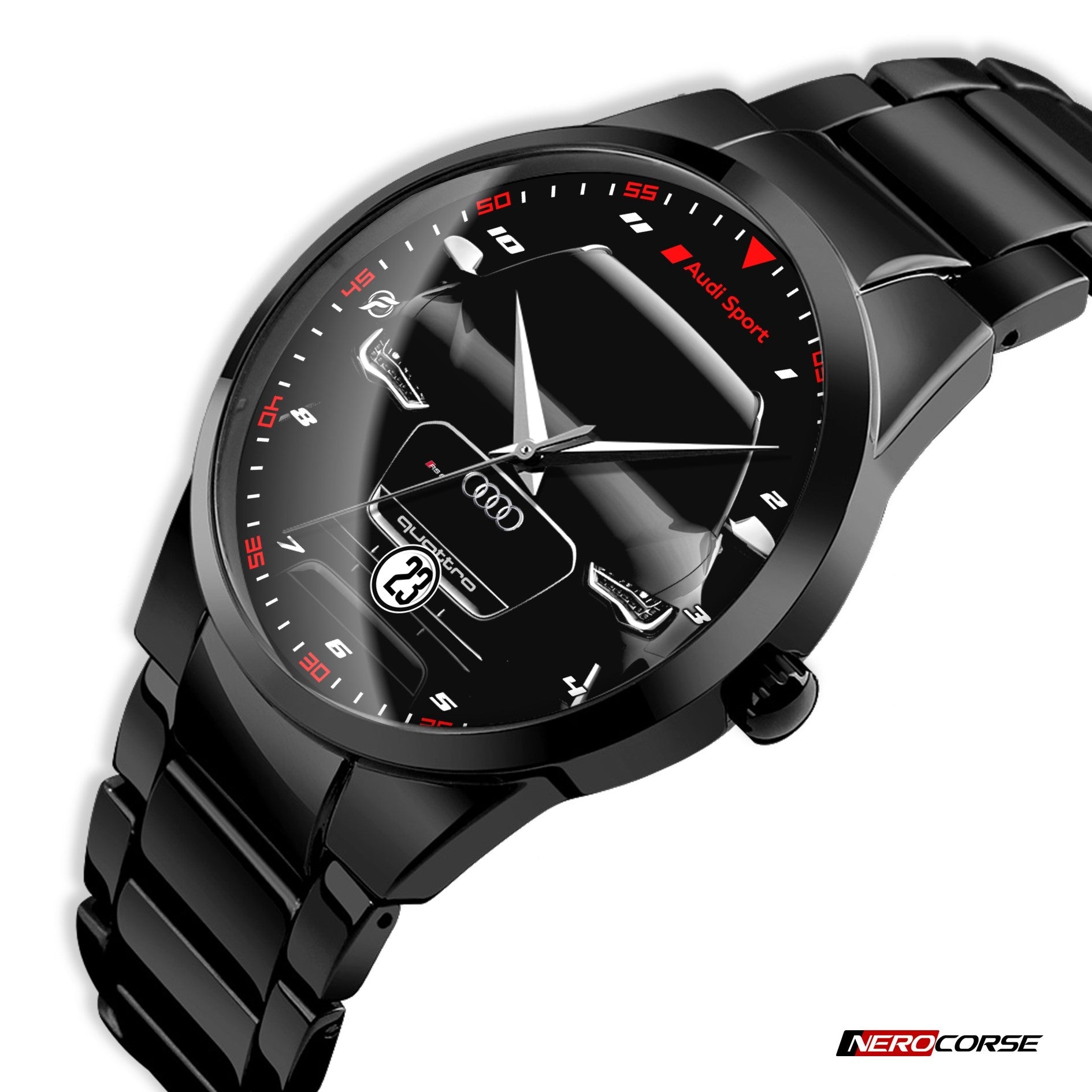 Caratteristiche tecniche dell'orologio modello Nerocorse: confezione in cartone rivestito inciso a laser. Il quadrante è realizzato con una superficie stampata ad alta definizione. Design unisex. La cassa ha un diametro di 40 mm ed è realizzata in acciaio inossidabile con finitura nera lucida. Il cinturino, anch'esso in acciaio inossidabile nero lucido, ha una larghezza di 20 mm e utilizza un sistema di chiusura con gancio rapido. L'orologio è dotato di un movimento al quarzo Epson alimentato a batteria. Il peso complessivo è di 114 grammi e offre una resistenza all'acqua fino a 3 ATM.