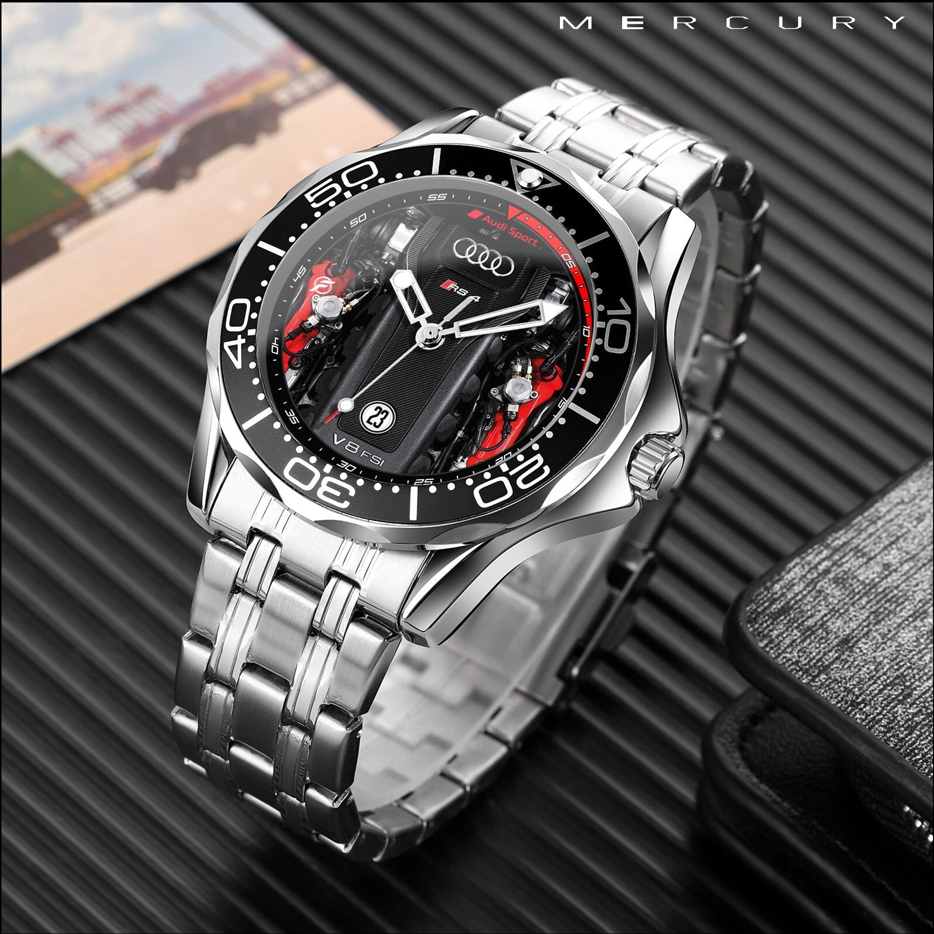 Caratteristiche tecniche dell'orologio Mercury: confezione in cartone rivestito inciso a laser. Il quadrante presenta una superficie stampata con indici sovraesposti. Design unisex. La cassa ha un diametro di 43 mm ed è realizzata in acciaio inossidabile. Il cinturino, anch'esso in acciaio inossidabile, ha una larghezza di 20 mm e utilizza un sistema di chiusura con gancio rapido. L'orologio è alimentato da un movimento al quarzo Epson a batteria. Il peso totale è di 136 grammi e offre una resistenza all'acqua fino a 3 ATM.