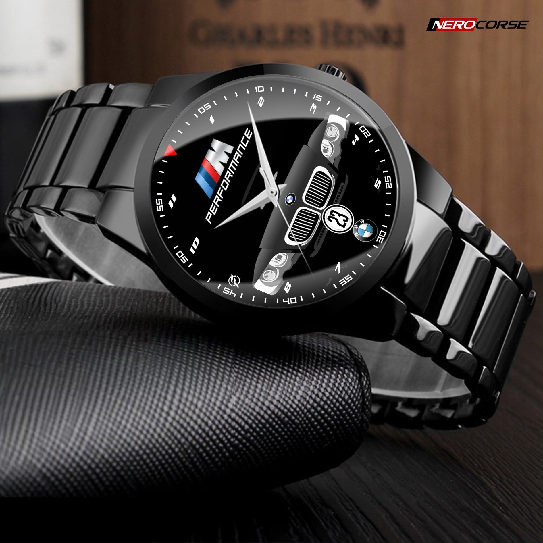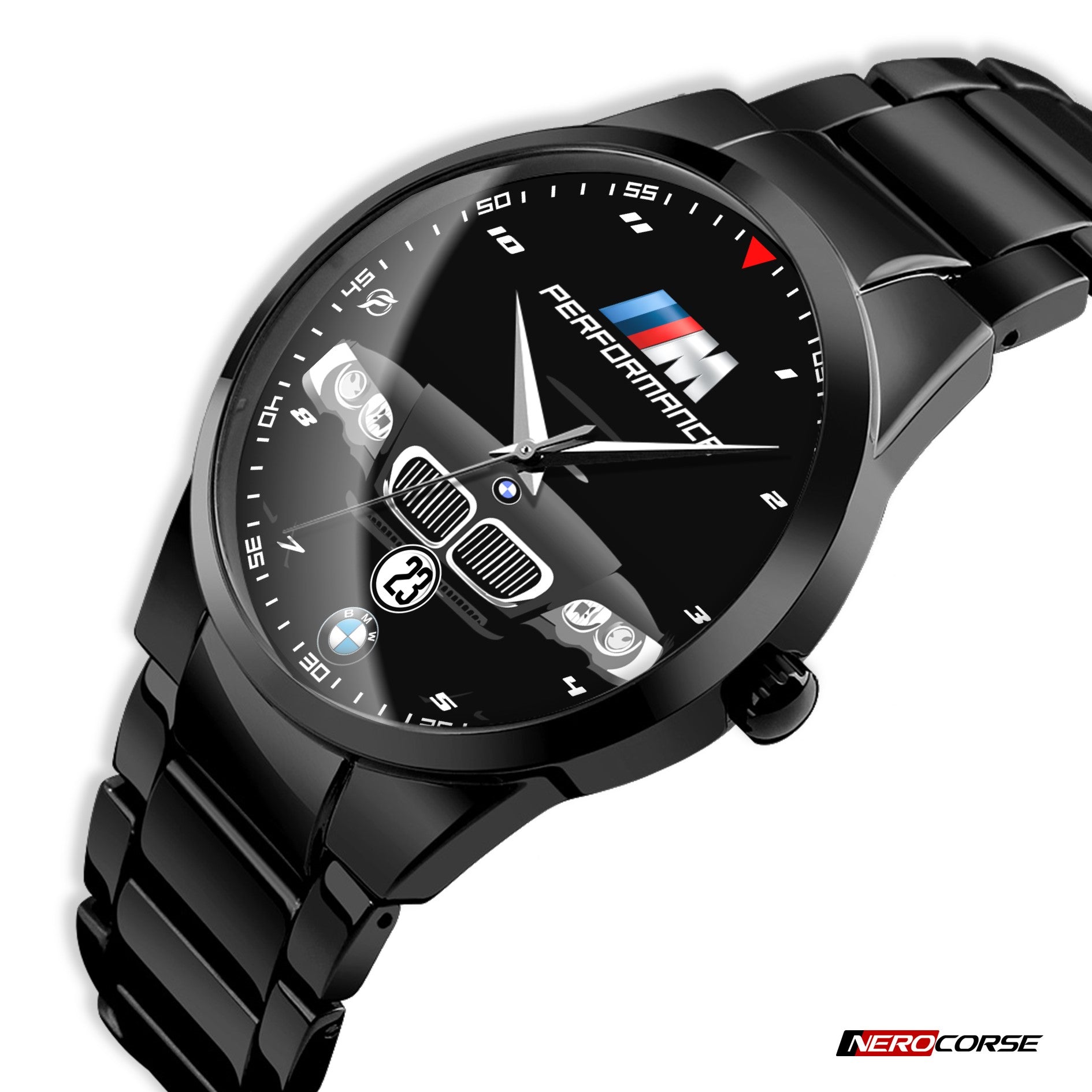 Caratteristiche tecniche dell'orologio modello Nerocorse: confezione in cartone rivestito inciso a laser. Il quadrante è realizzato con una superficie stampata ad alta definizione. Design unisex. La cassa ha un diametro di 40 mm ed è realizzata in acciaio inossidabile con finitura nera lucida. Il cinturino, anch'esso in acciaio inossidabile nero lucido, ha una larghezza di 20 mm e utilizza un sistema di chiusura con gancio rapido. L'orologio è dotato di un movimento al quarzo Epson alimentato a batteria. Il peso complessivo è di 114 grammi e offre una resistenza all'acqua fino a 3 ATM.