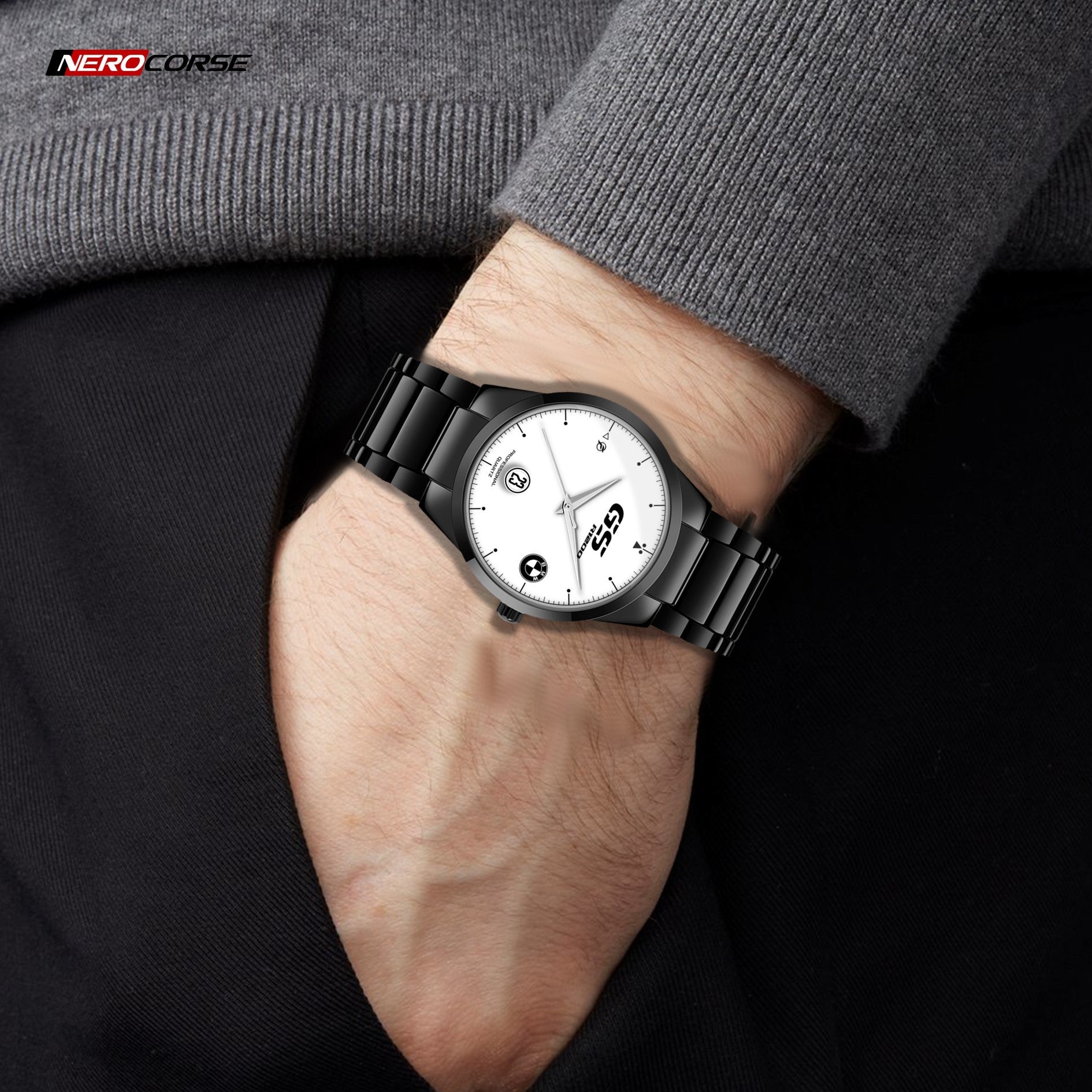 Caratteristiche tecniche dell'orologio modello Nerocorse: confezione in cartone rivestito inciso a laser. Il quadrante è realizzato con una superficie stampata ad alta definizione. Design unisex. La cassa ha un diametro di 40 mm ed è realizzata in acciaio inossidabile con finitura nera lucida. Il cinturino, anch'esso in acciaio inossidabile nero lucido, ha una larghezza di 20 mm e utilizza un sistema di chiusura con gancio rapido. L'orologio è dotato di un movimento al quarzo Epson alimentato a batteria. Il peso complessivo è di 114 grammi e offre una resistenza all'acqua fino a 3 ATM.