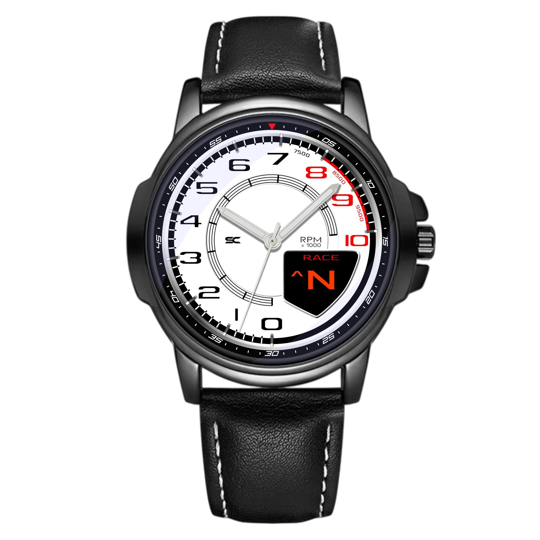 Cinturino in ecopelle nera, caratterizzato da una texture morbida e leggermente granulata, impreziosito da cuciture bianche a contrasto che ne esaltano lo stile sportivo ed elegante.
