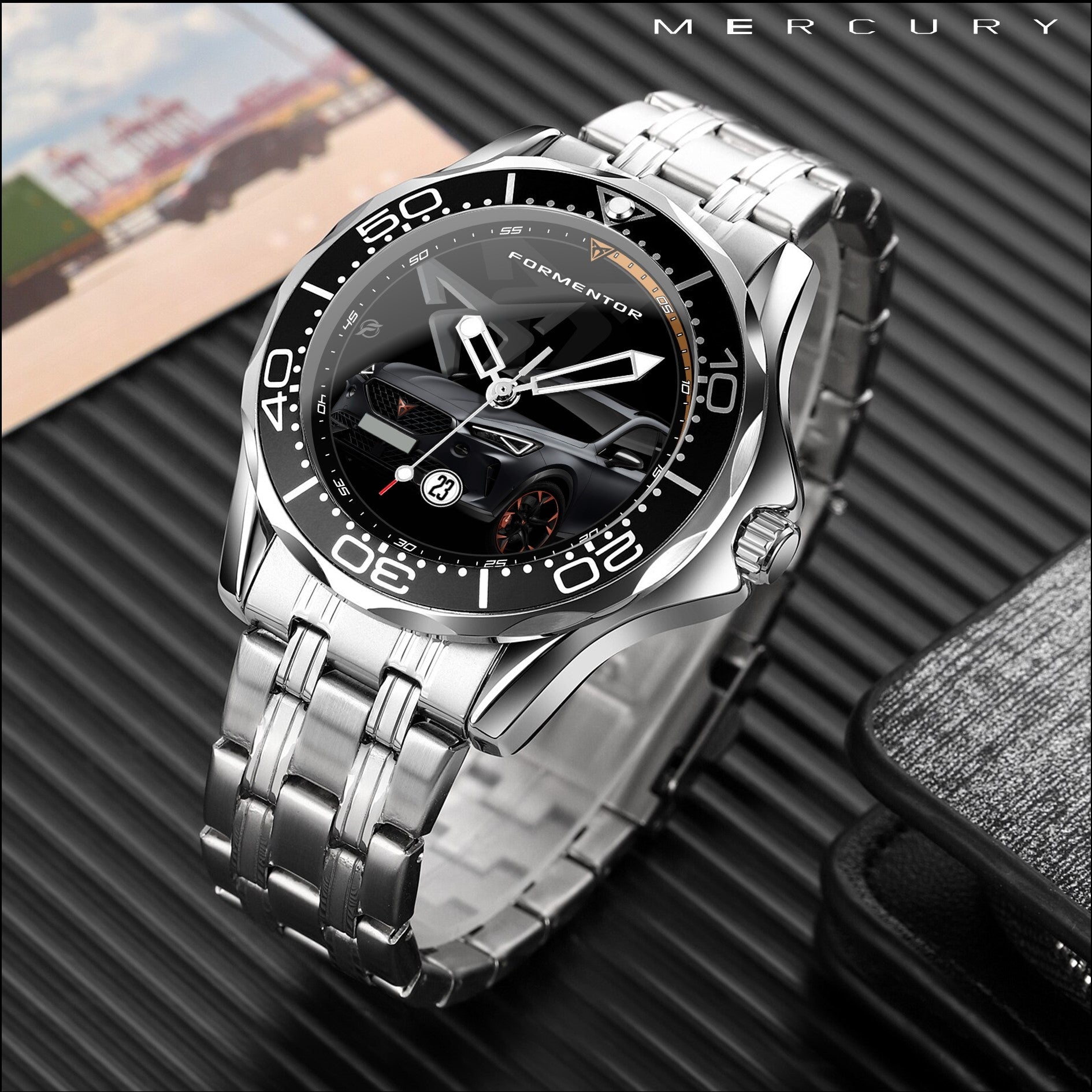 Caratteristiche tecniche dell'orologio Mercury: confezione in cartone rivestito inciso a laser. Il quadrante presenta una superficie stampata con indici sovraesposti. Design unisex. La cassa ha un diametro di 43 mm ed è realizzata in acciaio inossidabile. Il cinturino, anch'esso in acciaio inossidabile, ha una larghezza di 20 mm e utilizza un sistema di chiusura con gancio rapido. L'orologio è alimentato da un movimento al quarzo Epson a batteria. Il peso totale è di 136 grammi e offre una resistenza all'acqua fino a 3 ATM.