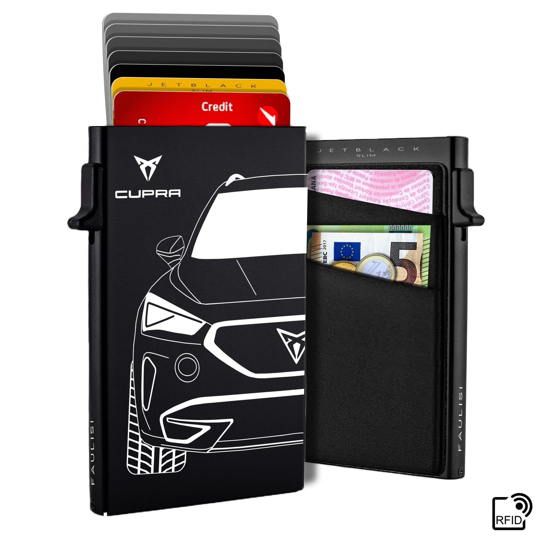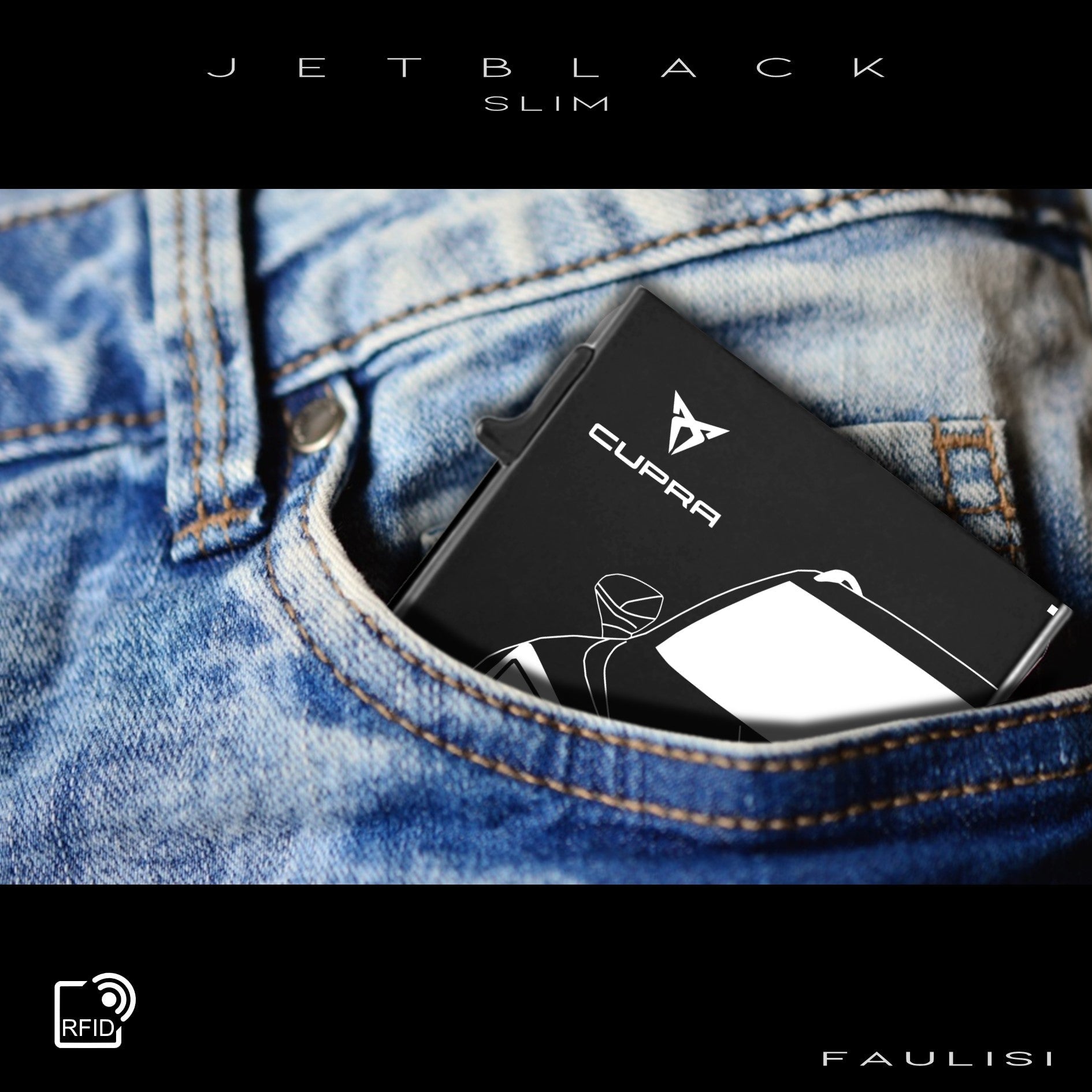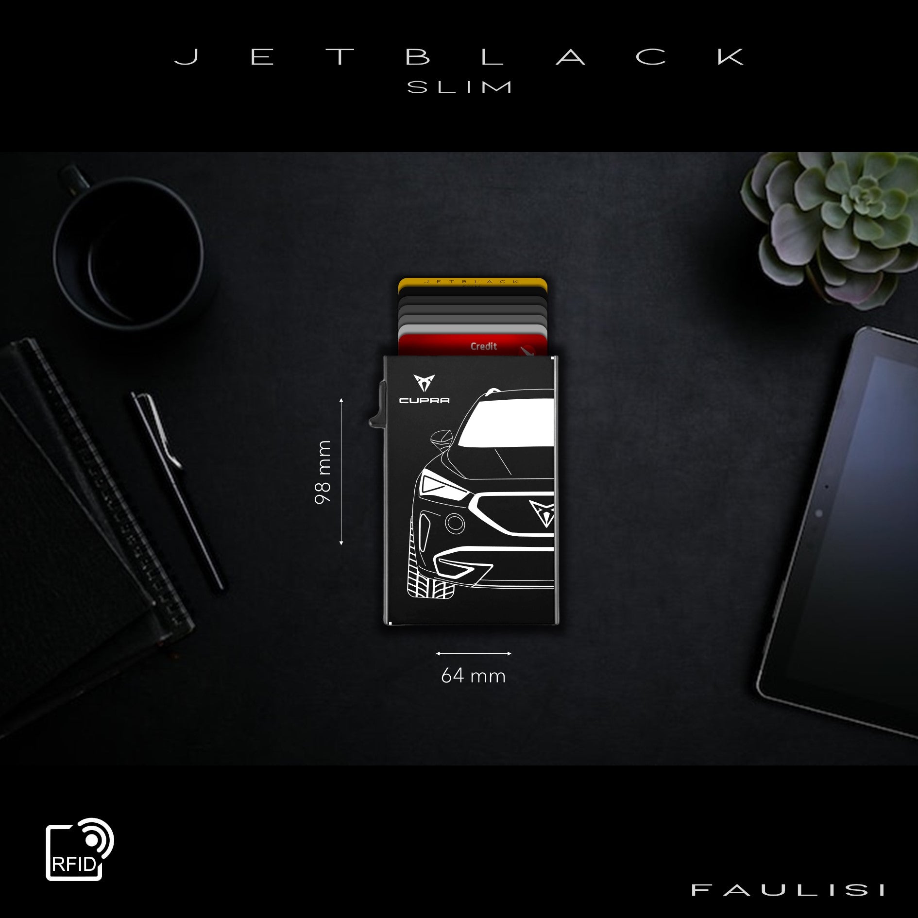 Caratteristiche tecniche del portacarte JetBlack Slim: confezione in cartone rivestito inciso a laser. Realizzato in alluminio anodizzato, con dimensioni di 9,8 cm x 6,4 cm x 1,2 cm. Ha una capienza di 7 carte flat e include 2 tasche aggiuntive. Dotato di protezione RFID. Design in alluminio inciso, colore nero.