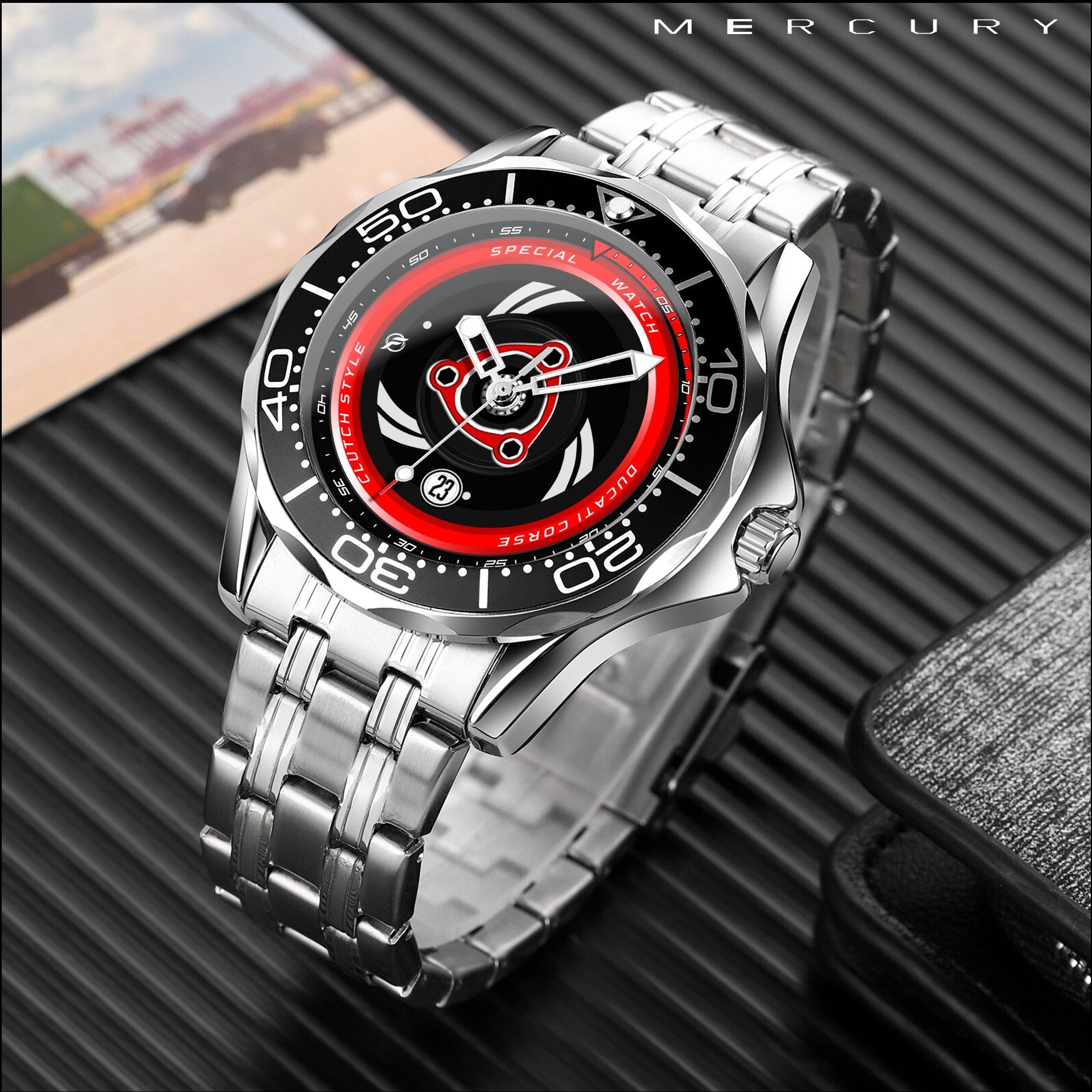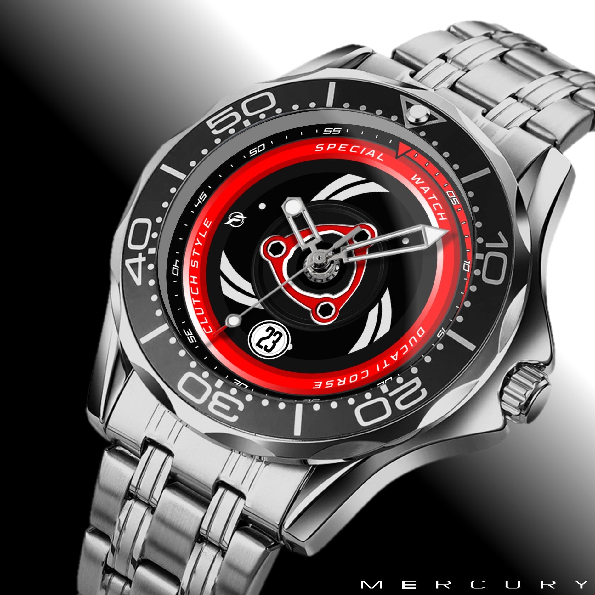 Caratteristiche tecniche dell'orologio Mercury: confezione in cartone rivestito inciso a laser. Il quadrante presenta una superficie stampata con indici sovraesposti. Design unisex. La cassa ha un diametro di 43 mm ed è realizzata in acciaio inossidabile. Il cinturino, anch'esso in acciaio inossidabile, ha una larghezza di 20 mm e utilizza un sistema di chiusura con gancio rapido. L'orologio è alimentato da un movimento al quarzo Epson a batteria. Il peso totale è di 136 grammi e offre una resistenza all'acqua fino a 3 ATM.