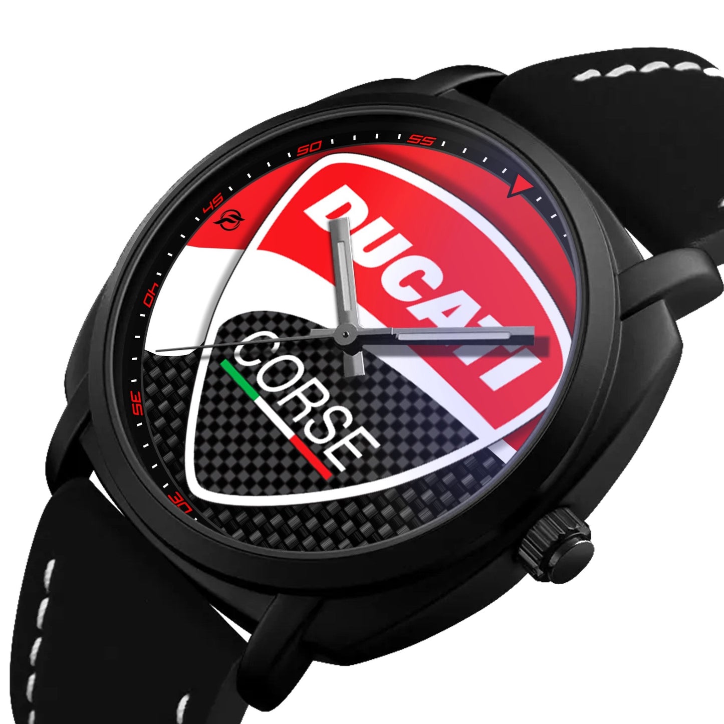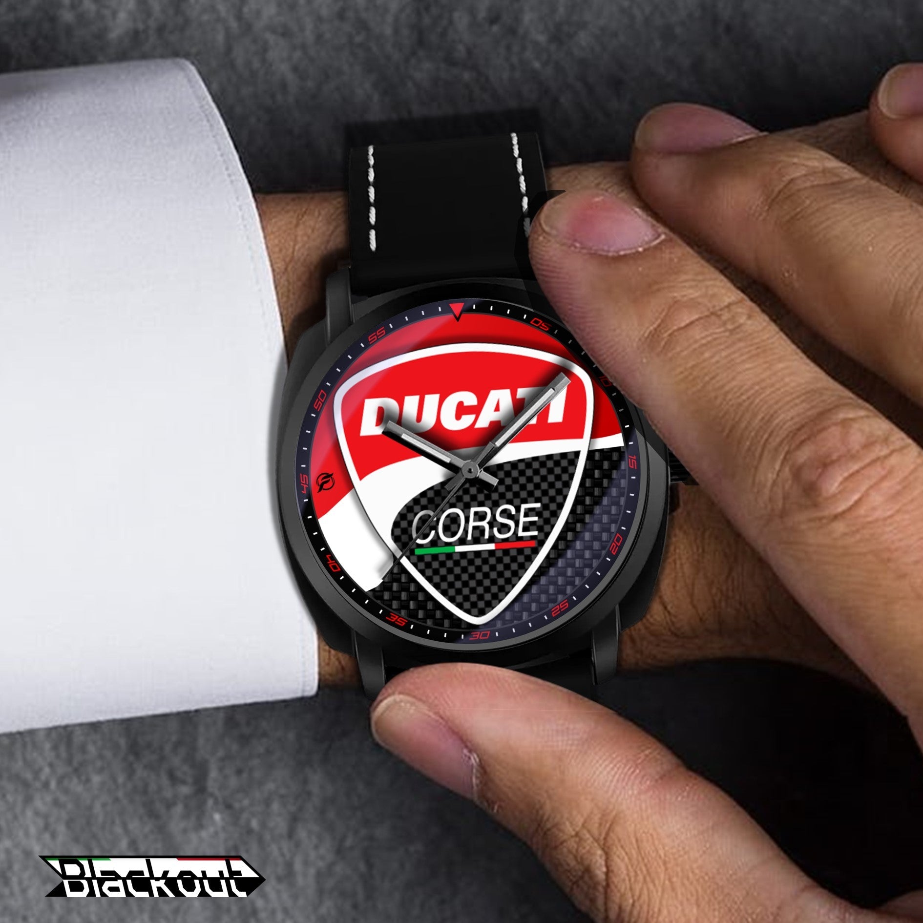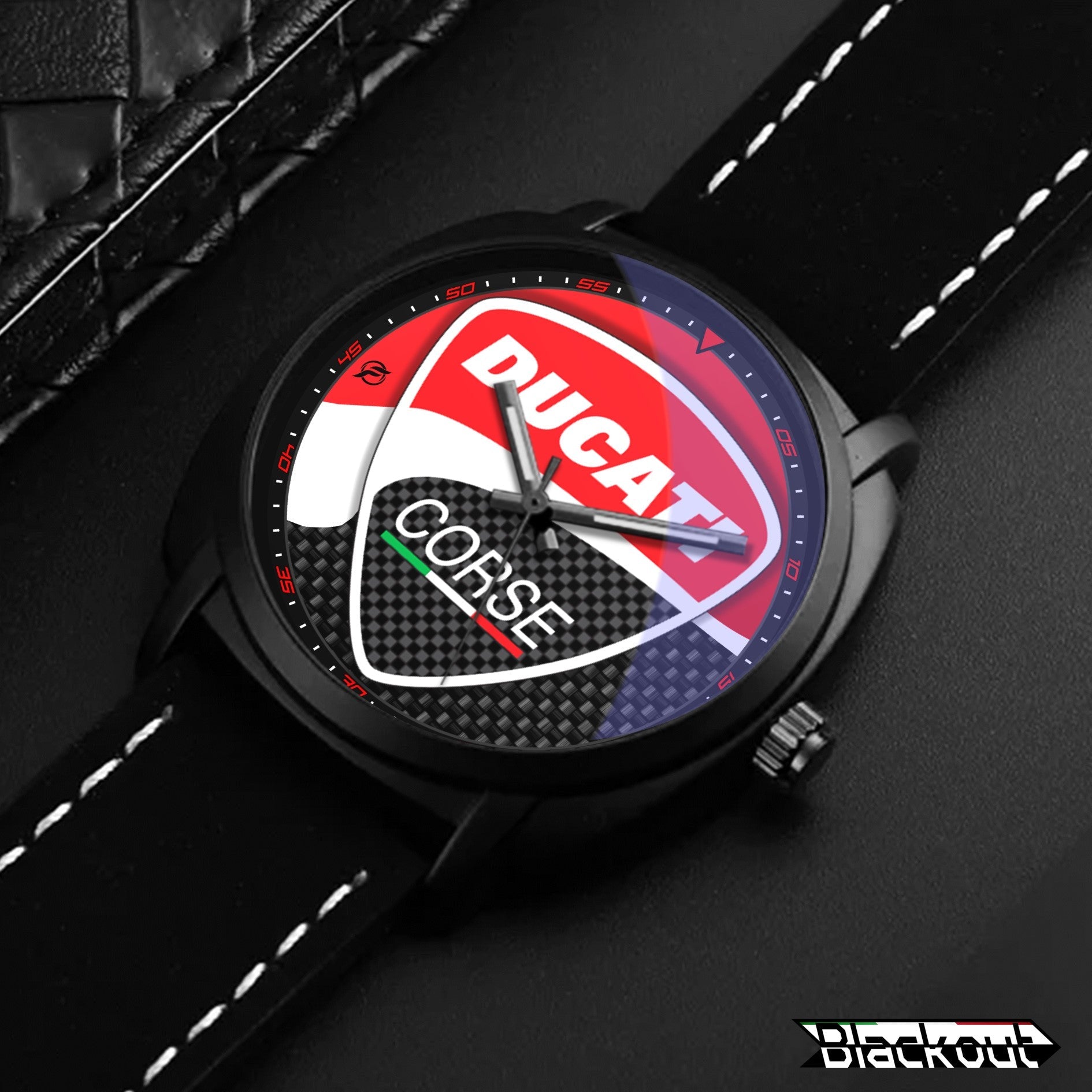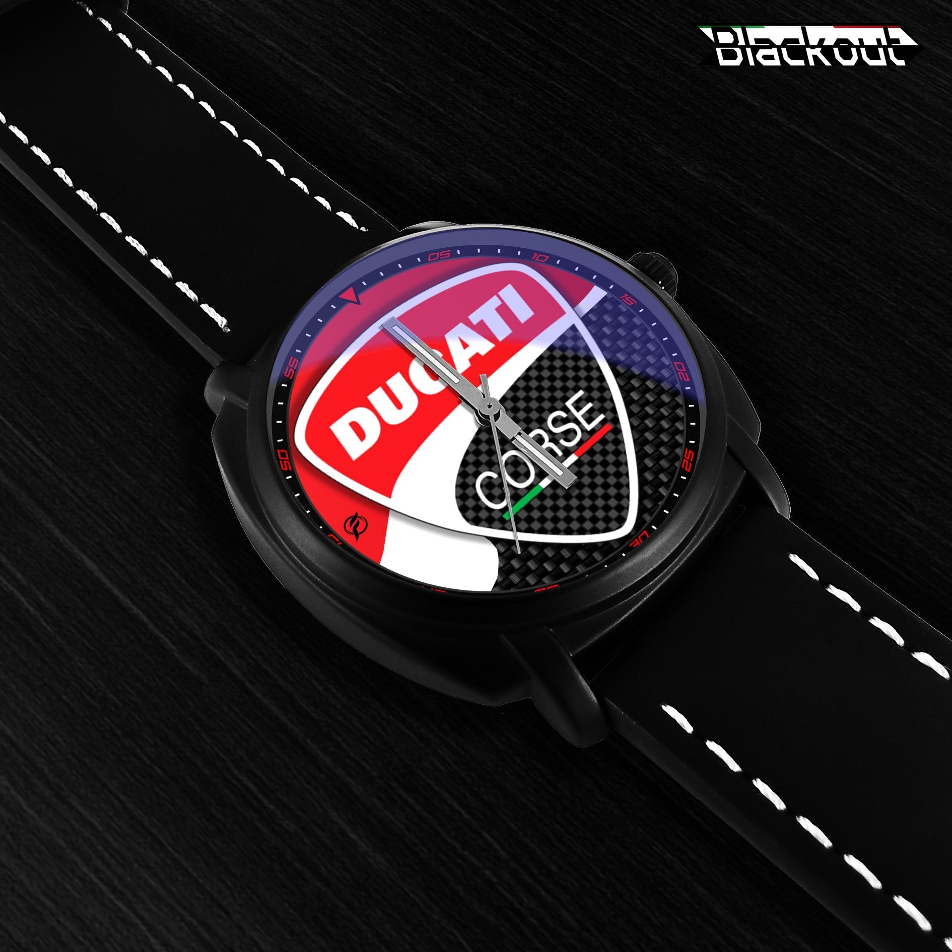 Caratteristiche tecniche dell'orologio Blackout: confezione in cartone rivestito inciso a laser, quadrante con superficie stampata da Canon, design unisex. La cassa ha un diametro di 42 mm ed è realizzata in acciaio inossidabile con finitura nera opaca. Il cinturino ha una larghezza di 22 mm ed è in eco-pelle con cuciture bianche. L'orologio è dotato di una fibbia come tipo di fermaglio e utilizza un movimento al quarzo Epson, alimentato a batteria. Il peso complessivo è di 56 grammi e la resistenza all'acqua è garantita fino a 3 ATM.