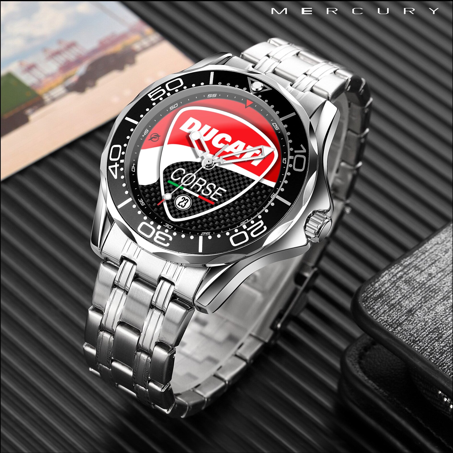 Caratteristiche tecniche dell'orologio Mercury: confezione in cartone rivestito inciso a laser. Il quadrante presenta una superficie stampata con indici sovraesposti. Design unisex. La cassa ha un diametro di 43 mm ed è realizzata in acciaio inossidabile. Il cinturino, anch'esso in acciaio inossidabile, ha una larghezza di 20 mm e utilizza un sistema di chiusura con gancio rapido. L'orologio è alimentato da un movimento al quarzo Epson a batteria. Il peso totale è di 136 grammi e offre una resistenza all'acqua fino a 3 ATM.