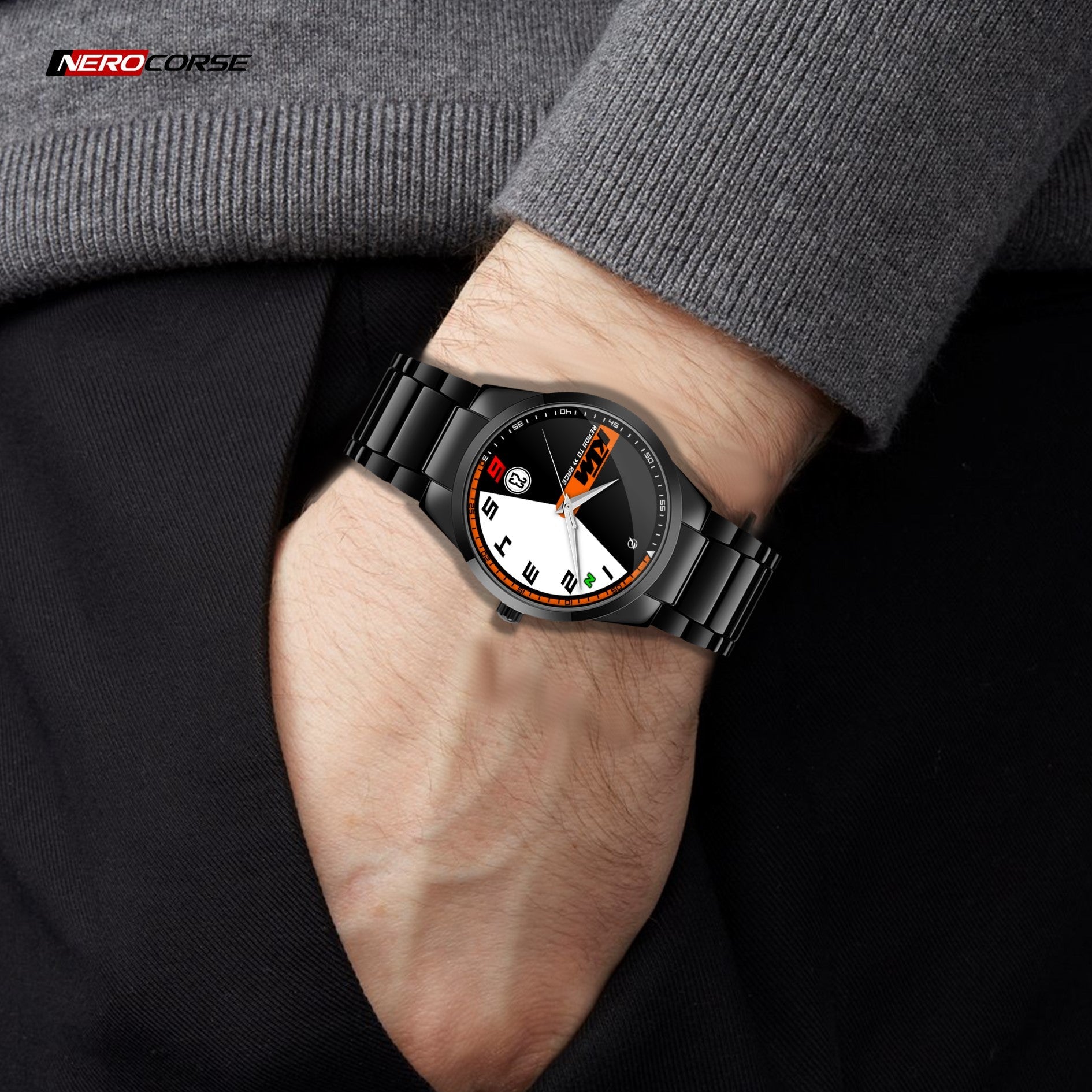 Caratteristiche tecniche dell'orologio modello Nerocorse: confezione in cartone rivestito inciso a laser. Il quadrante è realizzato con una superficie stampata ad alta definizione. Design unisex. La cassa ha un diametro di 40 mm ed è realizzata in acciaio inossidabile con finitura nera lucida. Il cinturino, anch'esso in acciaio inossidabile nero lucido, ha una larghezza di 20 mm e utilizza un sistema di chiusura con gancio rapido. L'orologio è dotato di un movimento al quarzo Epson alimentato a batteria. Il peso complessivo è di 114 grammi e offre una resistenza all'acqua fino a 3 ATM.