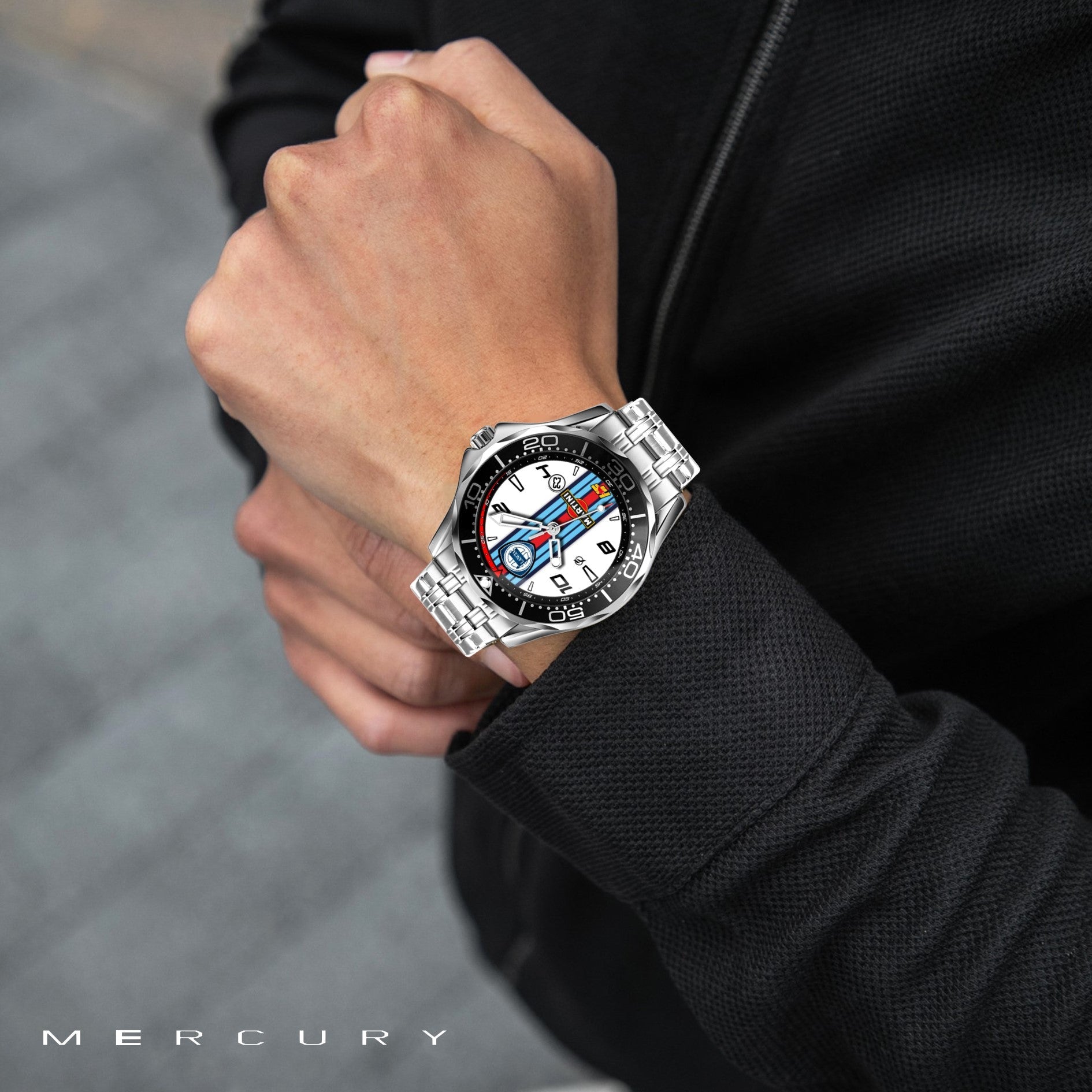 Caratteristiche tecniche dell'orologio Mercury: confezione in cartone rivestito inciso a laser. Il quadrante presenta una superficie stampata con indici sovraesposti. Design unisex. La cassa ha un diametro di 43 mm ed è realizzata in acciaio inossidabile. Il cinturino, anch'esso in acciaio inossidabile, ha una larghezza di 20 mm e utilizza un sistema di chiusura con gancio rapido. L'orologio è alimentato da un movimento al quarzo Epson a batteria. Il peso totale è di 136 grammi e offre una resistenza all'acqua fino a 3 ATM.