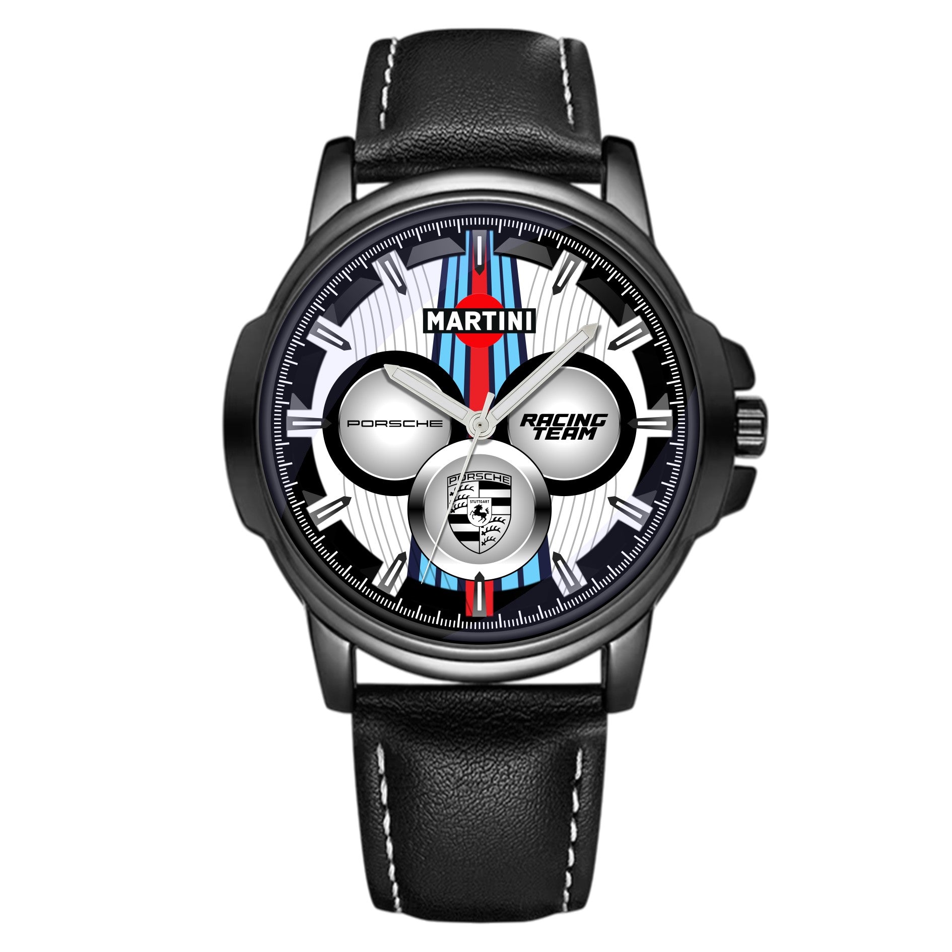 Cinturino in ecopelle nera, caratterizzato da una texture morbida e leggermente granulata, impreziosito da cuciture bianche a contrasto che ne esaltano lo stile sportivo ed elegante.