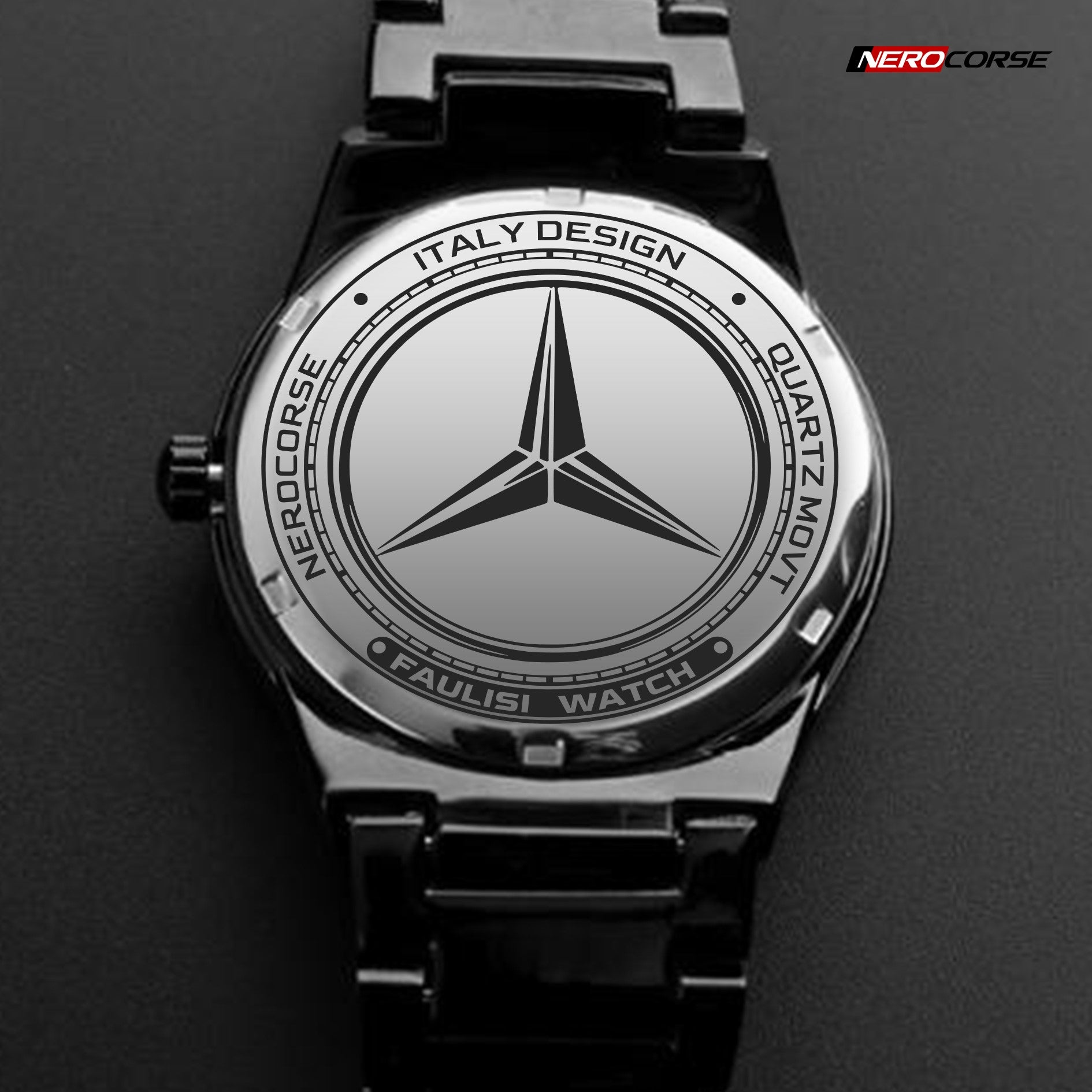 Caratteristiche tecniche dell'orologio modello Nerocorse: confezione in cartone rivestito inciso a laser. Il quadrante è realizzato con una superficie stampata ad alta definizione. Design unisex. La cassa ha un diametro di 40 mm ed è realizzata in acciaio inossidabile con finitura nera lucida. Il cinturino, anch'esso in acciaio inossidabile nero lucido, ha una larghezza di 20 mm e utilizza un sistema di chiusura con gancio rapido. L'orologio è dotato di un movimento al quarzo Epson alimentato a batteria. Il peso complessivo è di 114 grammi e offre una resistenza all'acqua fino a 3 ATM.