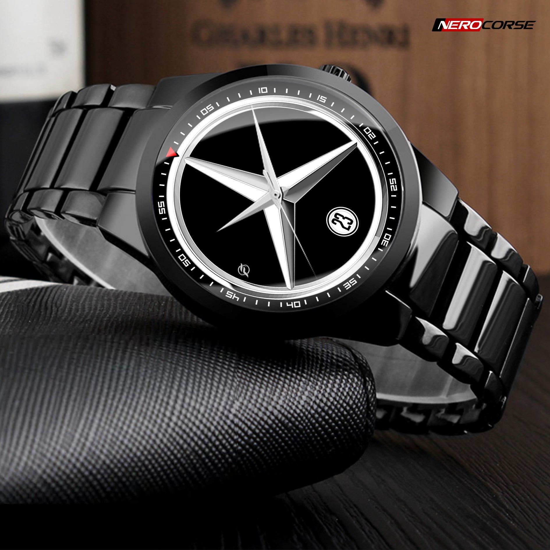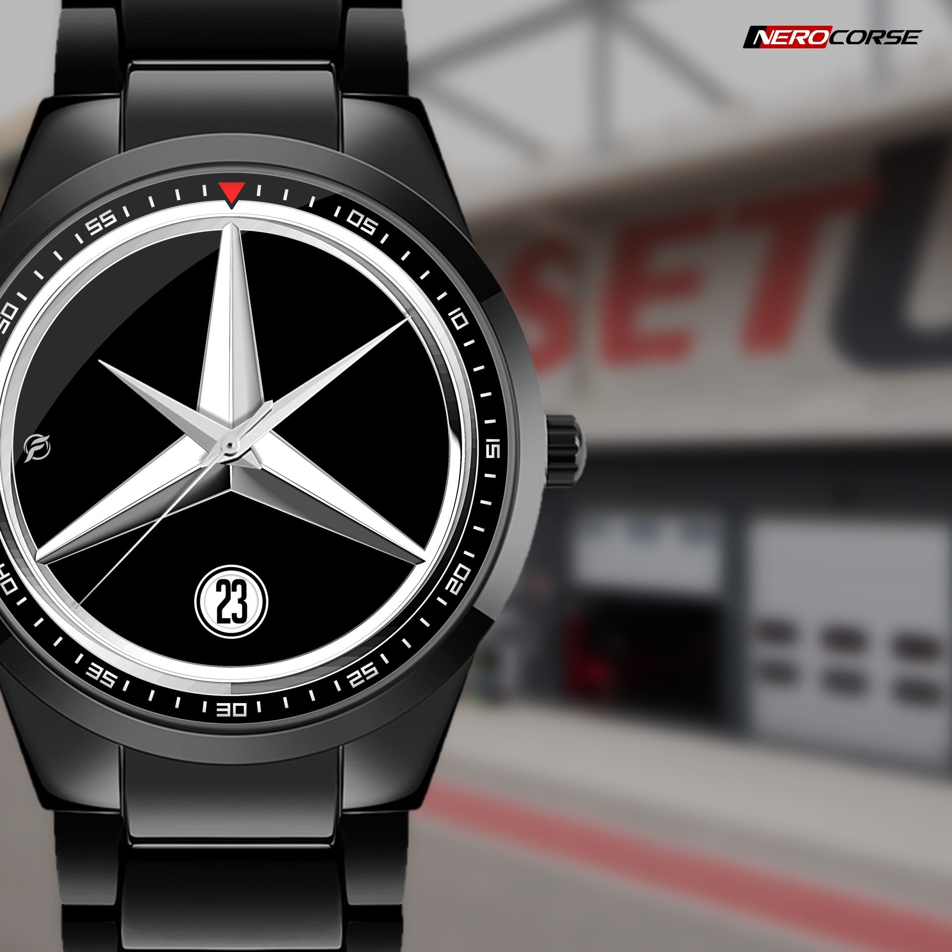 Caratteristiche tecniche dell'orologio modello Nerocorse: confezione in cartone rivestito inciso a laser. Il quadrante è realizzato con una superficie stampata ad alta definizione. Design unisex. La cassa ha un diametro di 40 mm ed è realizzata in acciaio inossidabile con finitura nera lucida. Il cinturino, anch'esso in acciaio inossidabile nero lucido, ha una larghezza di 20 mm e utilizza un sistema di chiusura con gancio rapido. L'orologio è dotato di un movimento al quarzo Epson alimentato a batteria. Il peso complessivo è di 114 grammi e offre una resistenza all'acqua fino a 3 ATM.