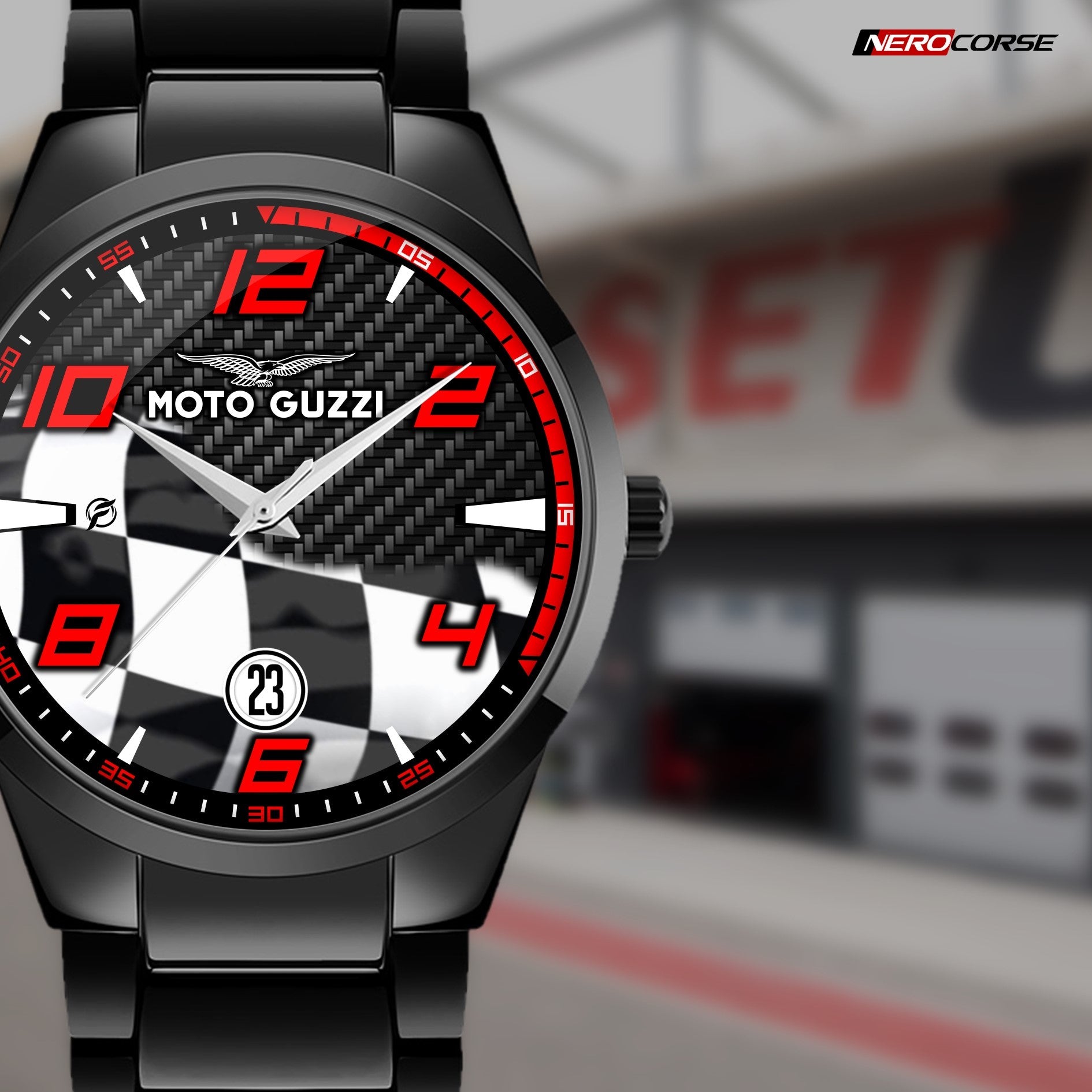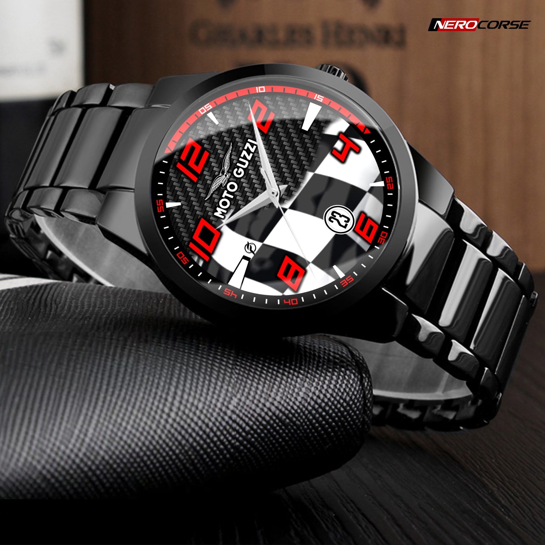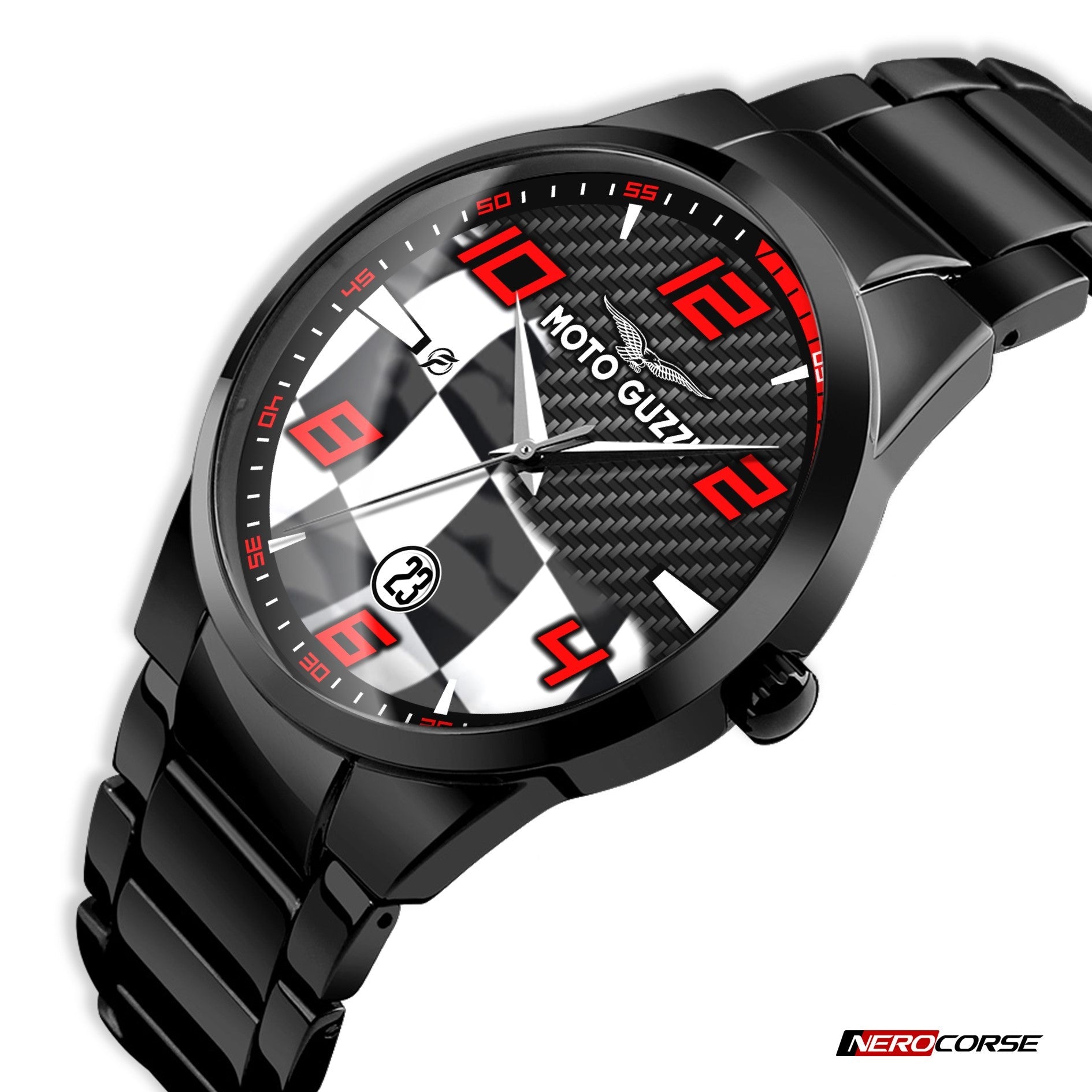 Caratteristiche tecniche dell'orologio modello Nerocorse: confezione in cartone rivestito inciso a laser. Il quadrante è realizzato con una superficie stampata ad alta definizione. Design unisex. La cassa ha un diametro di 40 mm ed è realizzata in acciaio inossidabile con finitura nera lucida. Il cinturino, anch'esso in acciaio inossidabile nero lucido, ha una larghezza di 20 mm e utilizza un sistema di chiusura con gancio rapido. L'orologio è dotato di un movimento al quarzo Epson alimentato a batteria. Il peso complessivo è di 114 grammi e offre una resistenza all'acqua fino a 3 ATM.