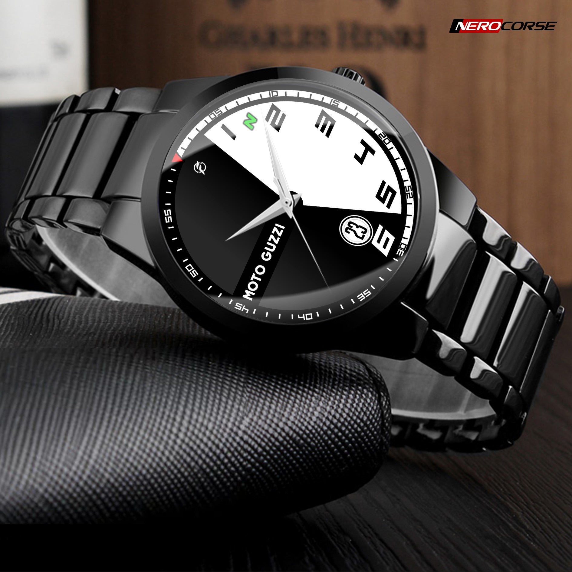 Caratteristiche tecniche dell'orologio modello Nerocorse: confezione in cartone rivestito inciso a laser. Il quadrante è realizzato con una superficie stampata ad alta definizione. Design unisex. La cassa ha un diametro di 40 mm ed è realizzata in acciaio inossidabile con finitura nera lucida. Il cinturino, anch'esso in acciaio inossidabile nero lucido, ha una larghezza di 20 mm e utilizza un sistema di chiusura con gancio rapido. L'orologio è dotato di un movimento al quarzo Epson alimentato a batteria. Il peso complessivo è di 114 grammi e offre una resistenza all'acqua fino a 3 ATM.
