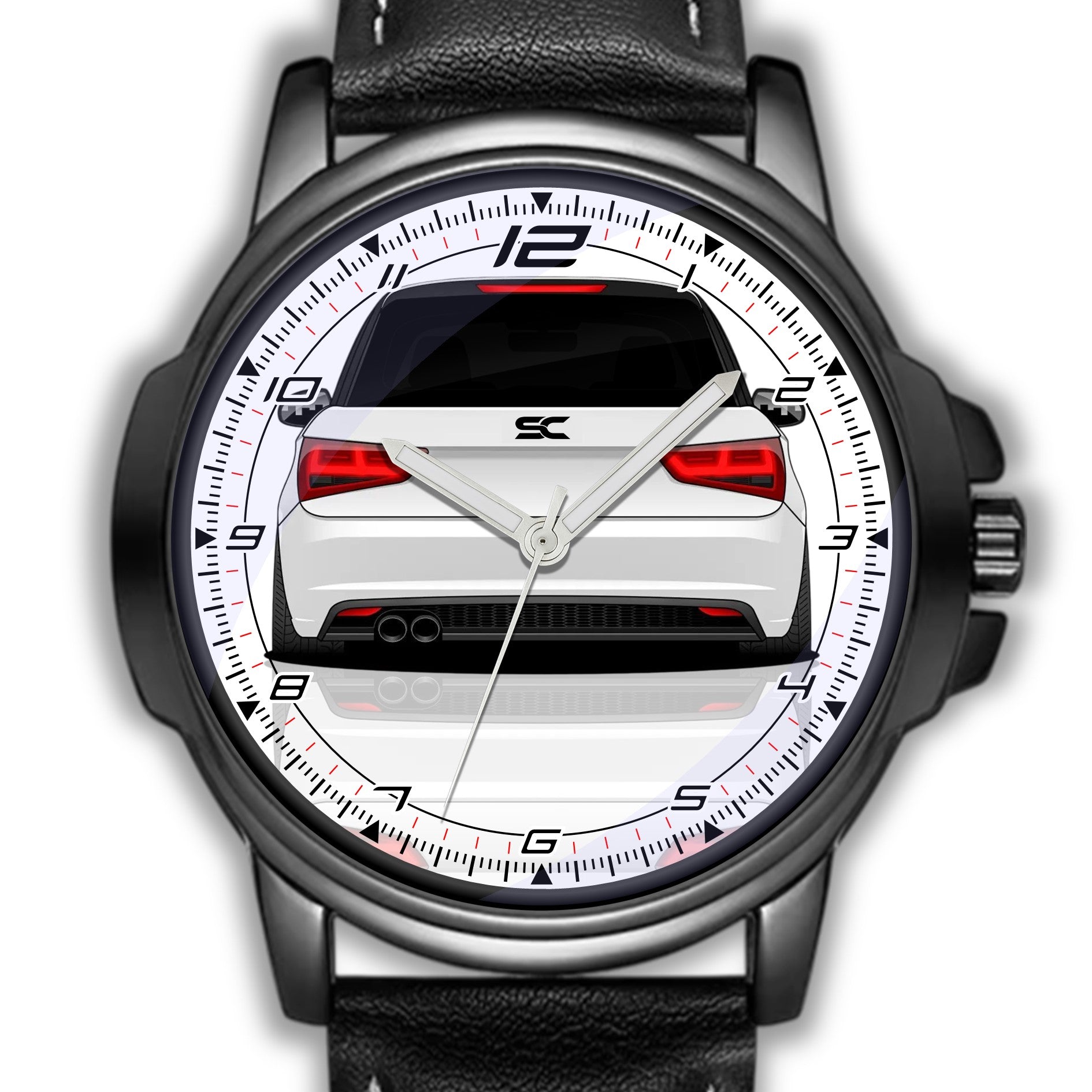 Cinturino in ecopelle nera, caratterizzato da una texture morbida e leggermente granulata, impreziosito da cuciture bianche a contrasto che ne esaltano lo stile sportivo ed elegante.