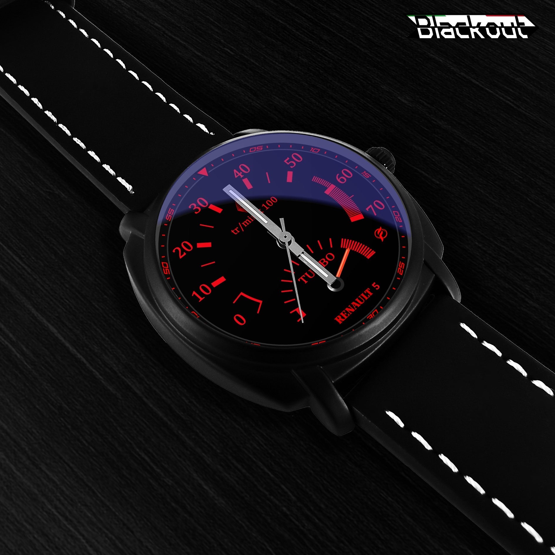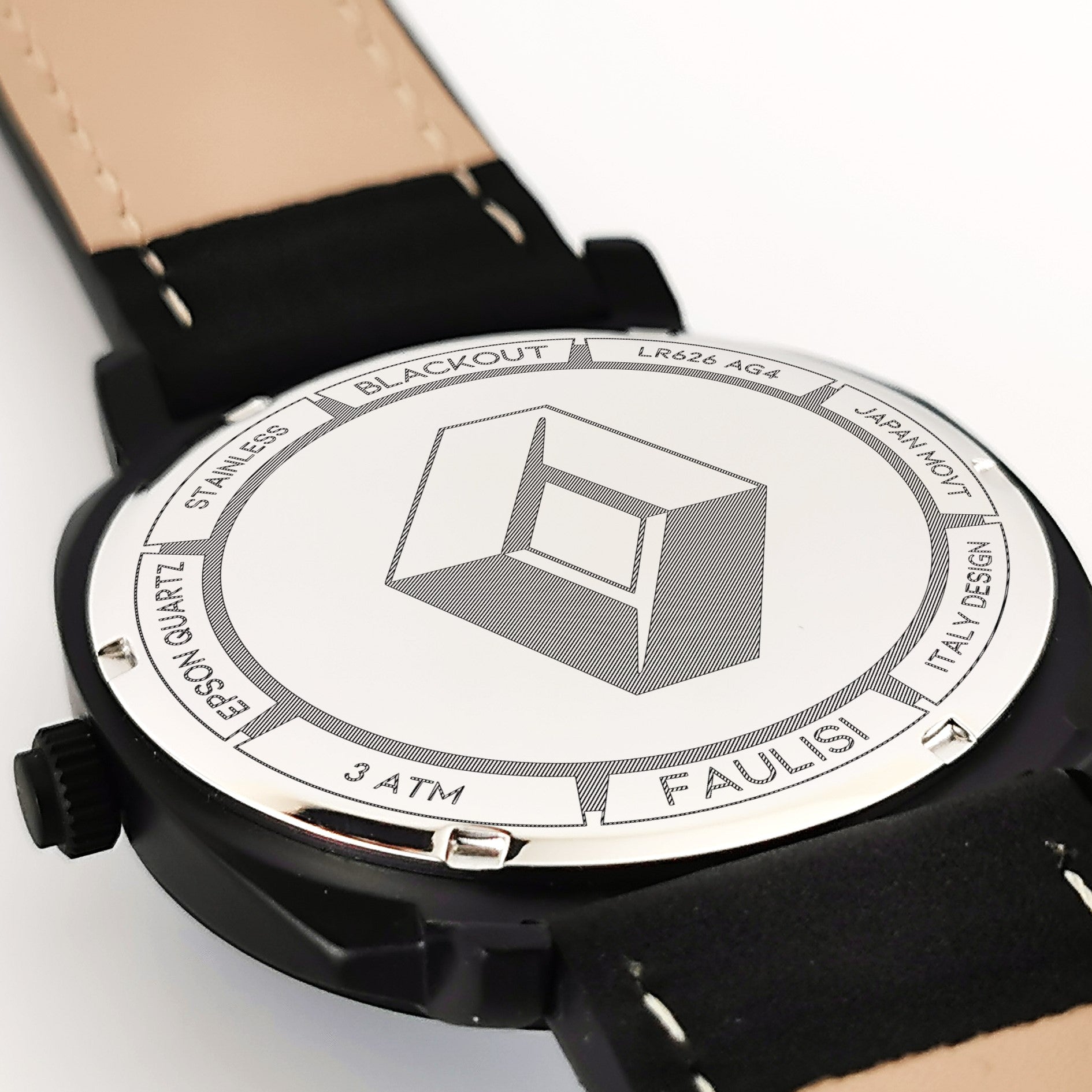 Caratteristiche tecniche dell'orologio Blackout: confezione in cartone rivestito inciso a laser, quadrante con superficie stampata da Canon, design unisex. La cassa ha un diametro di 42 mm ed è realizzata in acciaio inossidabile con finitura nera opaca. Il cinturino ha una larghezza di 22 mm ed è in eco-pelle con cuciture bianche. L'orologio è dotato di una fibbia come tipo di fermaglio e utilizza un movimento al quarzo Epson, alimentato a batteria. Il peso complessivo è di 56 grammi e la resistenza all'acqua è garantita fino a 3 ATM.