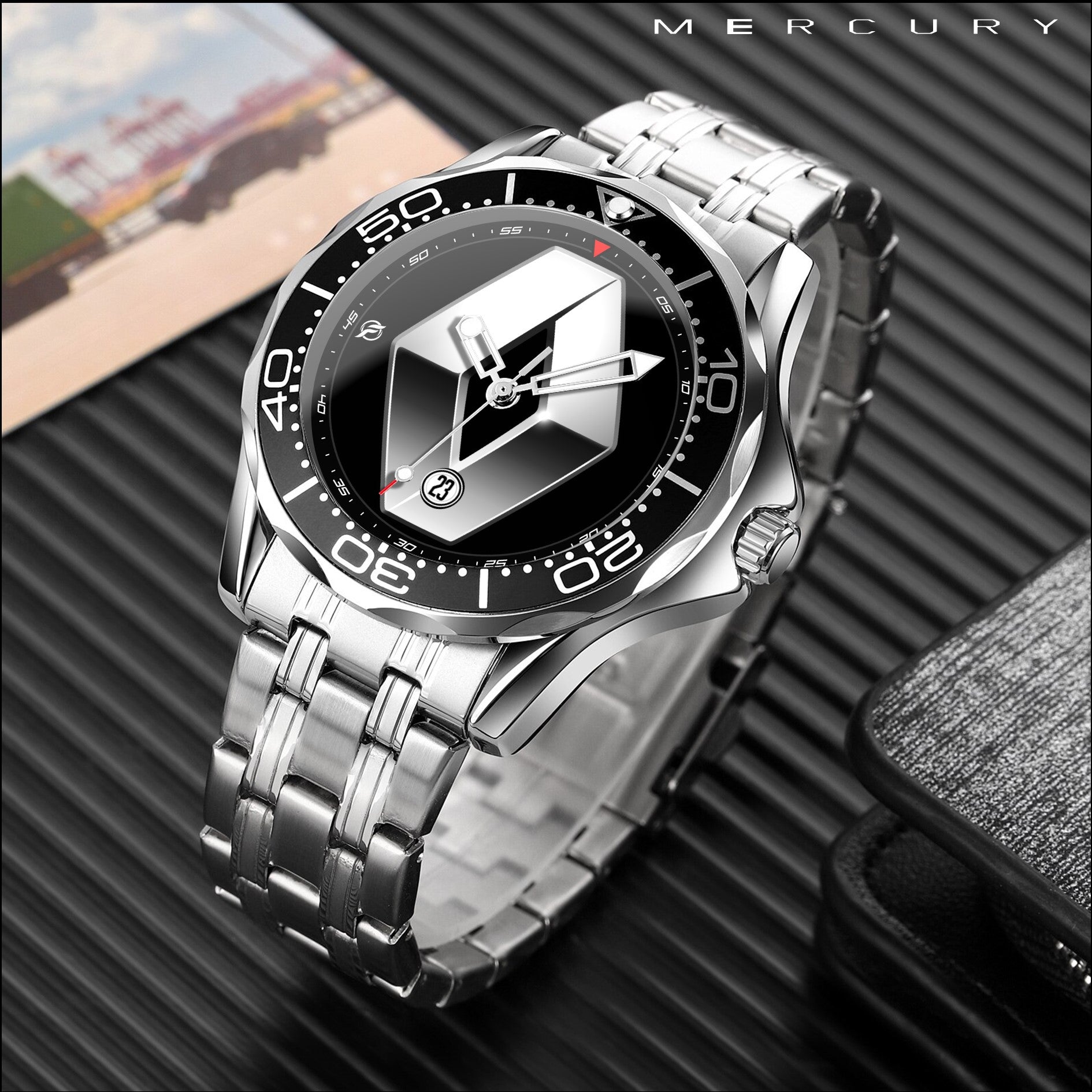 Caratteristiche tecniche dell'orologio Mercury: confezione in cartone rivestito inciso a laser. Il quadrante presenta una superficie stampata con indici sovraesposti. Design unisex. La cassa ha un diametro di 43 mm ed è realizzata in acciaio inossidabile. Il cinturino, anch'esso in acciaio inossidabile, ha una larghezza di 20 mm e utilizza un sistema di chiusura con gancio rapido. L'orologio è alimentato da un movimento al quarzo Epson a batteria. Il peso totale è di 136 grammi e offre una resistenza all'acqua fino a 3 ATM.