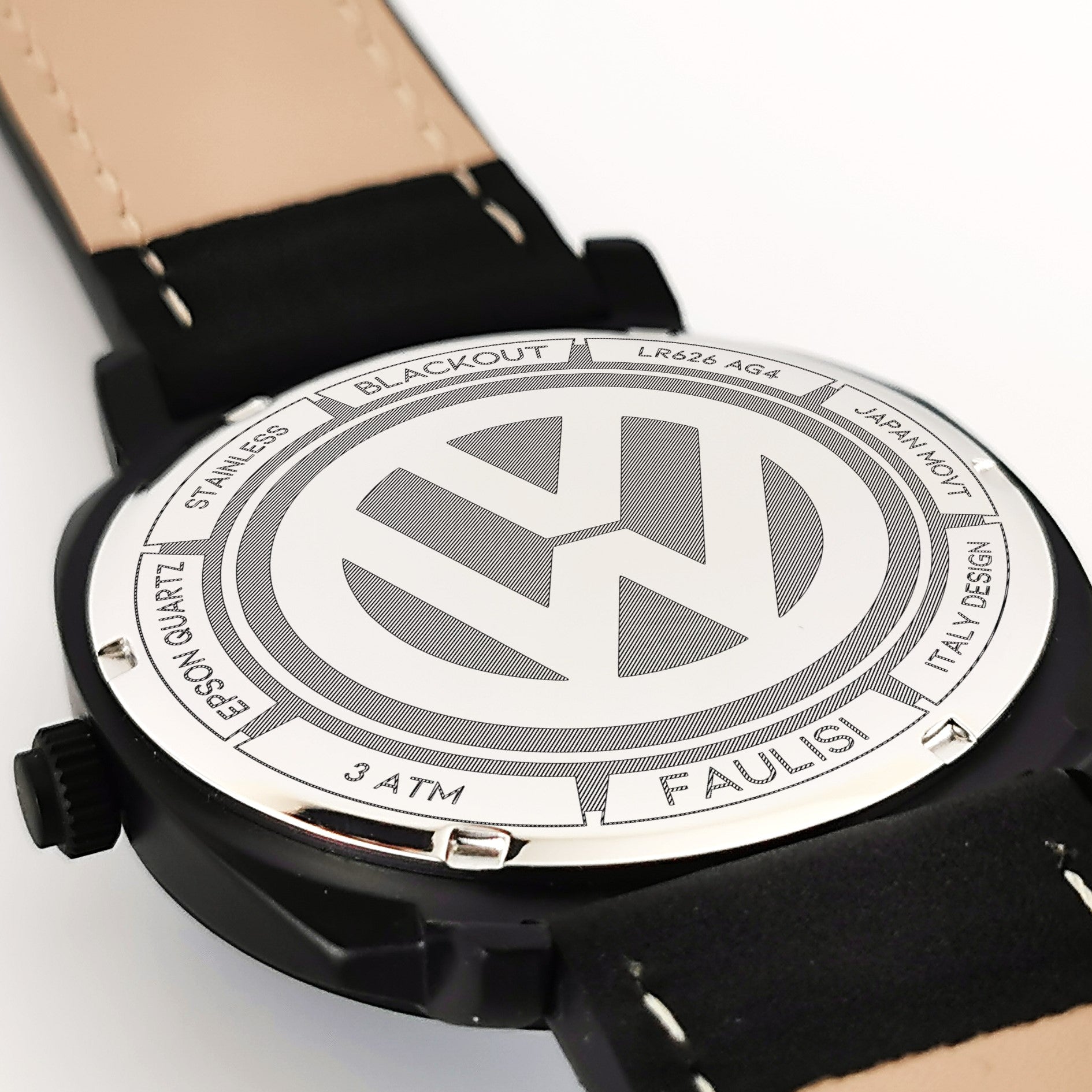 Caratteristiche tecniche dell'orologio Blackout: confezione in cartone rivestito inciso a laser, quadrante con superficie stampata da Canon, design unisex. La cassa ha un diametro di 42 mm ed è realizzata in acciaio inossidabile con finitura nera opaca. Il cinturino ha una larghezza di 22 mm ed è in eco-pelle con cuciture bianche. L'orologio è dotato di una fibbia come tipo di fermaglio e utilizza un movimento al quarzo Epson, alimentato a batteria. Il peso complessivo è di 56 grammi e la resistenza all'acqua è garantita fino a 3 ATM.